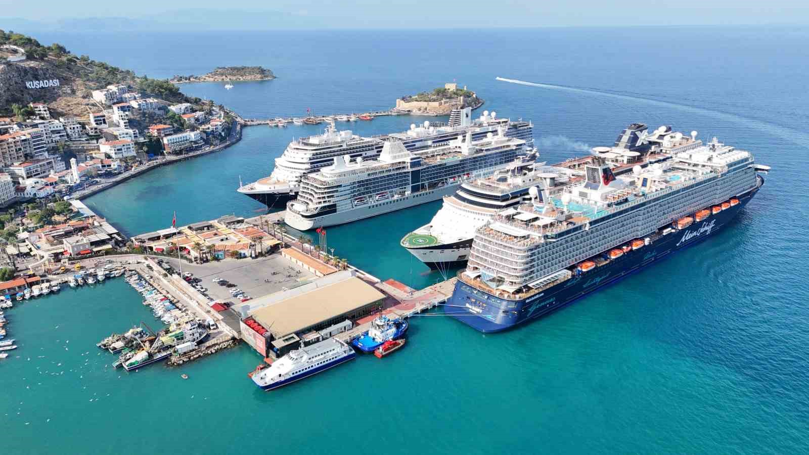 Kruvaziyer turizminin başkenti olan Kuşadası’na yüzen oteller bir biri ardına demir atıyor. Geçtiğimiz günlerde, Ekim ayında 91 geminin geleceğinin duyurulmasının ardından bugün sabah saatlerinde dört kruvaziyer gemisi Ege Port limanına yanaştı. Malta Bayraklı Celebrity Cruises, Mein Schiff 5, Hollanda Bayraklı Nieuw Statendam ile Bahama Bayraklı Silver Ray isimli kruvaziyer gemilerinden inen büyük kısmı ABD’li 11 bin 596 yolcunun bir bölümü Efes Antik Kenti ile Meryem Ana Evi’ni ziyaret için ilçeden ayrılırken tur programına katılmayan yolcular ise kent merkezinde kalıp, kafe ve restoranlarda oturdu, çarşıda alışveriş yaptı. Kuşadası’na gelen dev gemiler esnafın yüzünü güldürürken aynı zamanda ülke ekonomisine de katkıda bulunuyor.