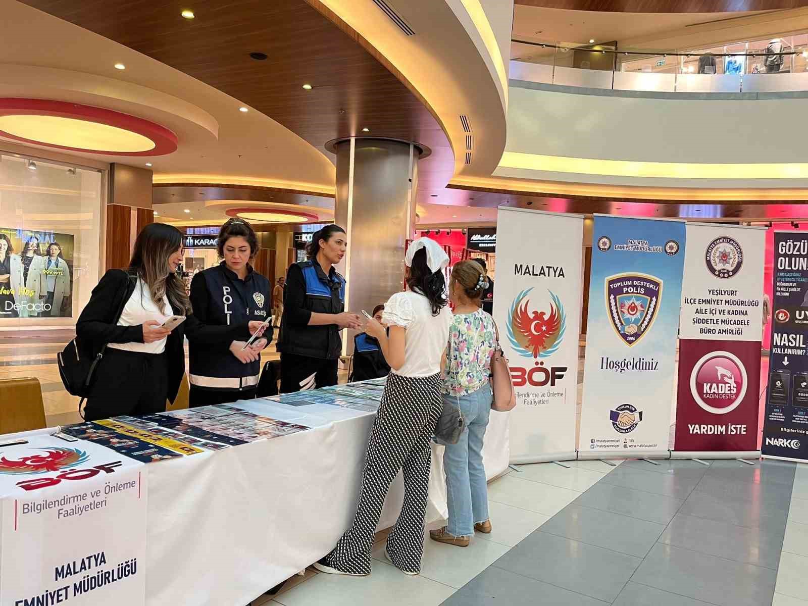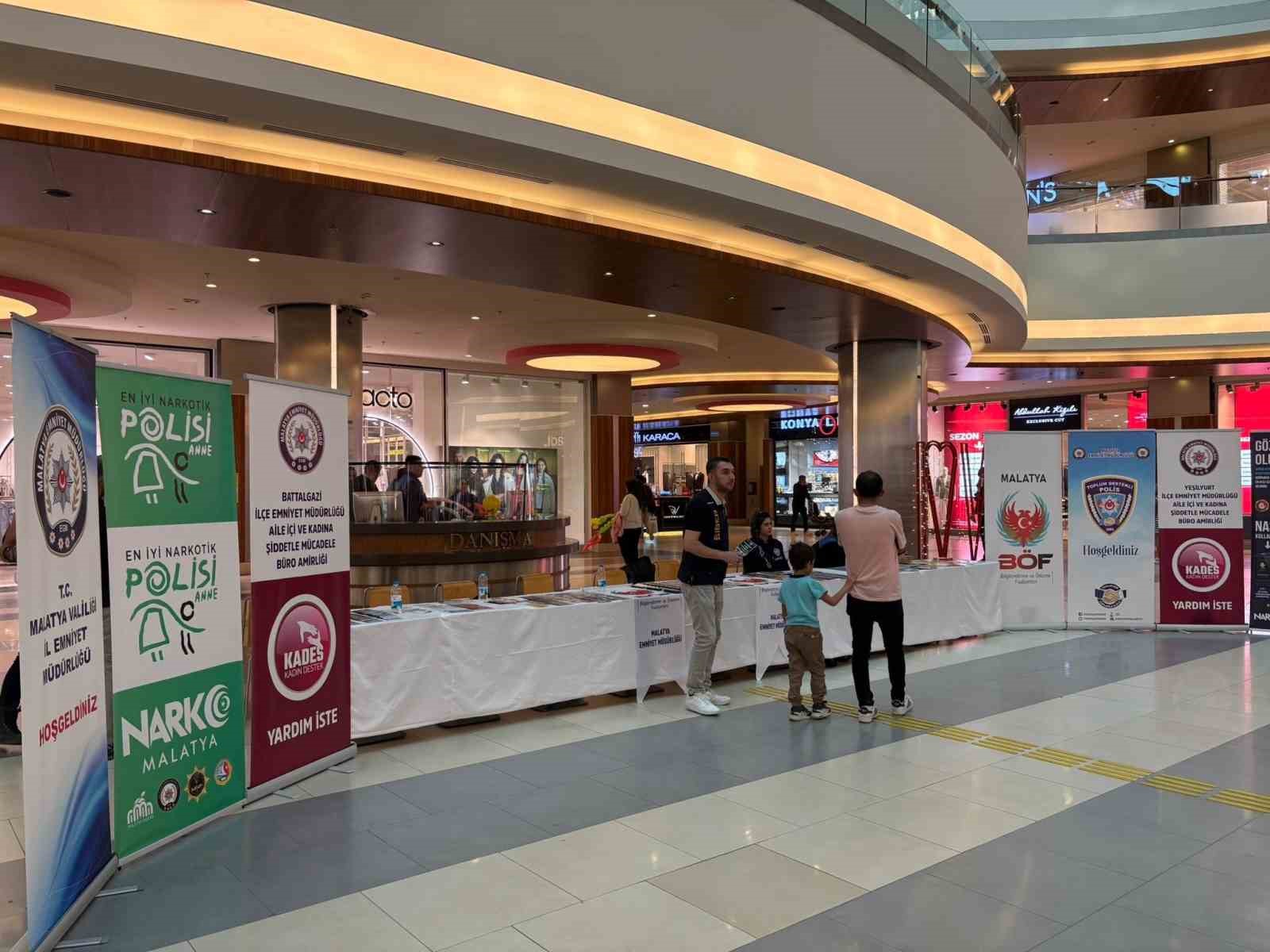Malatya Emniyet Müdürlüğü tarafından Toplum Destekli Polislik Şube Müdürlüğü işbirliğiyle MalatyaPark AVM’de bir bilgilendirme etkinliği düzenlendi. Etkinlikte, Narkotik Şube Müdürlüğü, Yeşilyurt ve Battalgazi Aile İçi Büro Amirlikleri ve Siber Suçlarla Mücadele Şube Müdürlüğü ekipleri, AVM ziyaretçilerini UYUMA ve KADES uygulamalarının indirilmesi, yasa dışı faaliyetlere karşı duyarlılık, genel güvenlik önlemleri ve telefon/internet dolandırıcılığı gibi konularda bilgilendirdi.