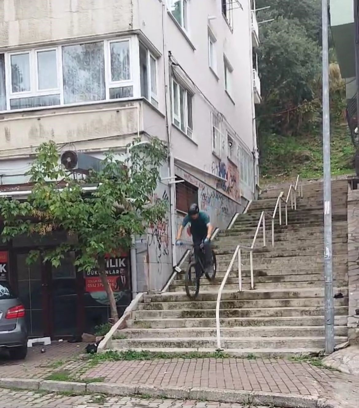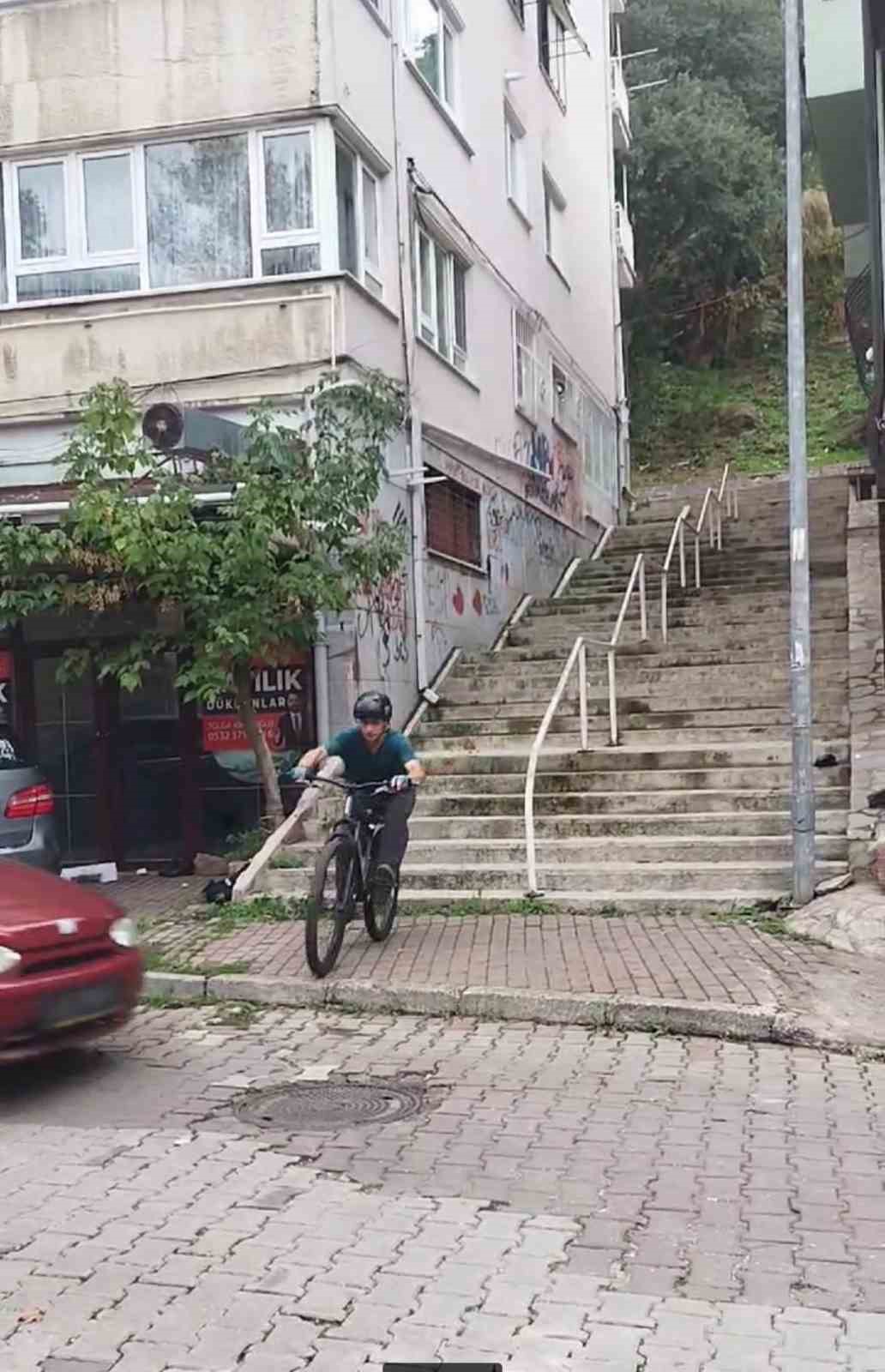 Bursa’da, downhill (tepeden inme) sporcusu, 225 basamaklı dik merdivenden bisikletle indiği anlar sosyal medyada viral oldu. Bu görüntülerden sonra sporcu genç tarihi sokakların arasında bulunan merdivenleri parkur olarak kullanmaya başlandı.
