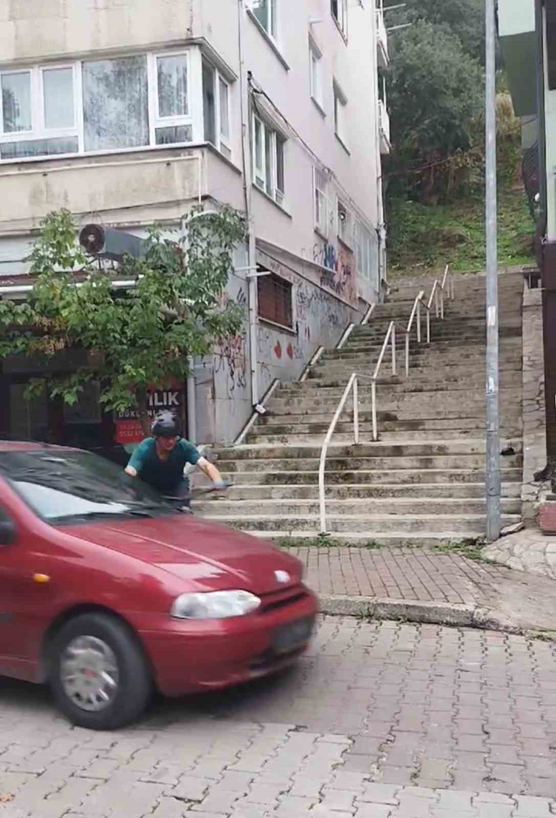 Çılgın genç, merkez Osmangazi ilçesi Yahşibey, Bozkurt Caddesi üzerinde bulunan merdivenlerden bisikletiyle iniş yapmak istedi. Arkadaşı ise o anları sosyal medyada paylaşmak için kayda başladı. Gencin bisikletiyle aşağı indiği esnada yoldan geçen otomobili gören arkadaşı uyarmaya kalksa da hızını alan bisikletli otomobilin kendisine çarpmasıyla savruldu. O anlar kameraya anbean yansıdı.
