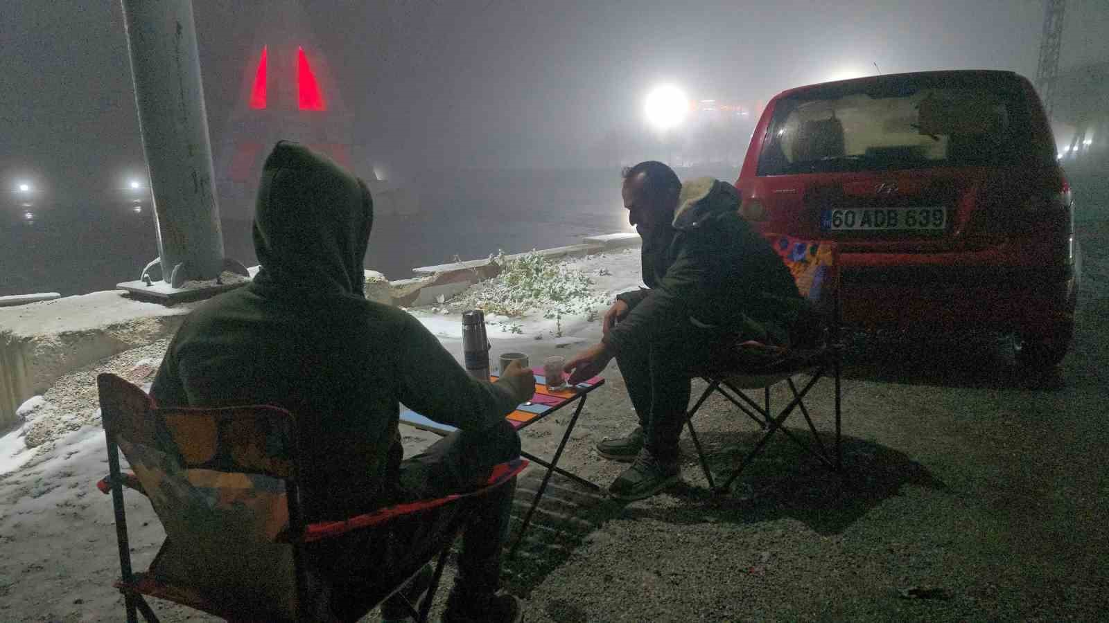Kar yağışını fırsat bilen bazı vatandaşlar masa kurup kahvesini yudumlarken kimileri ise fotoğraf çekmeyi ihmal etmedi.