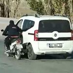 Olay, merkez Karatay ilçesi Adana Çevre Yolu Caddesi üzerinde meydana geldi. Edinilen bilgiye göre, plakası belli olmayan bir motosiklet sürücüsü, bir hafif ticari aracın sürücü kısmındaki açık olan camdan kapıya tutundu. Motosiklet sürücüsünün kasksız bir şekilde araca tutunarak tehlikeli yolculuğu bir vatandaşın cep telefonu kamerasına yansıdı. Görüntülerde motosiklet sürücüsü ve hafif ticari aracın trafikte ilerlemesi yer alıyor.