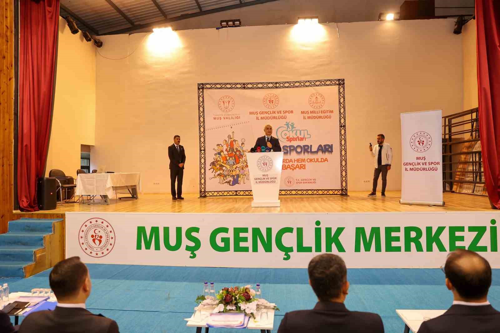 Muş Valiliği, Gençlik ve Spor İl Müdürlüğü ve Milli Eğitim Müdürlüğü iş birliğiyle “Hem Sporda Hem Okulda Başarı” mottosuyla Gençlik Merkezi konferans salonunda düzenlenen toplantı, saygı duruşunda bulunulması ve İstiklal Marşı’nın okunmasıyla başladı.
