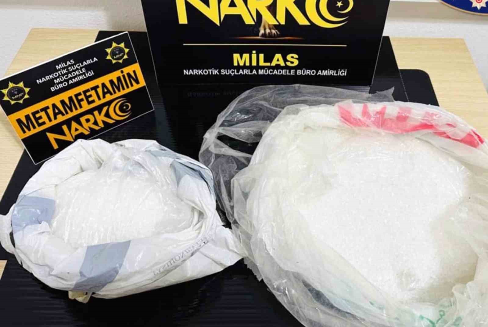 Muğla İl Emniyet Müdürlüğü Narkotik Suçlarla Mücadele Şube Müdürlüğü ve KOM Şube Müdürlüğü ekiplerince Milas ilçesinde bir ikamette narkotik köpeği ‘Çiko’ ile yapılan aramada, 5 kilo 938 gram metamfetamin ele geçirildi. Uyuşturucu ticareti suçu kapsamında 4 şüpheli şahıs gözaltına alındı.