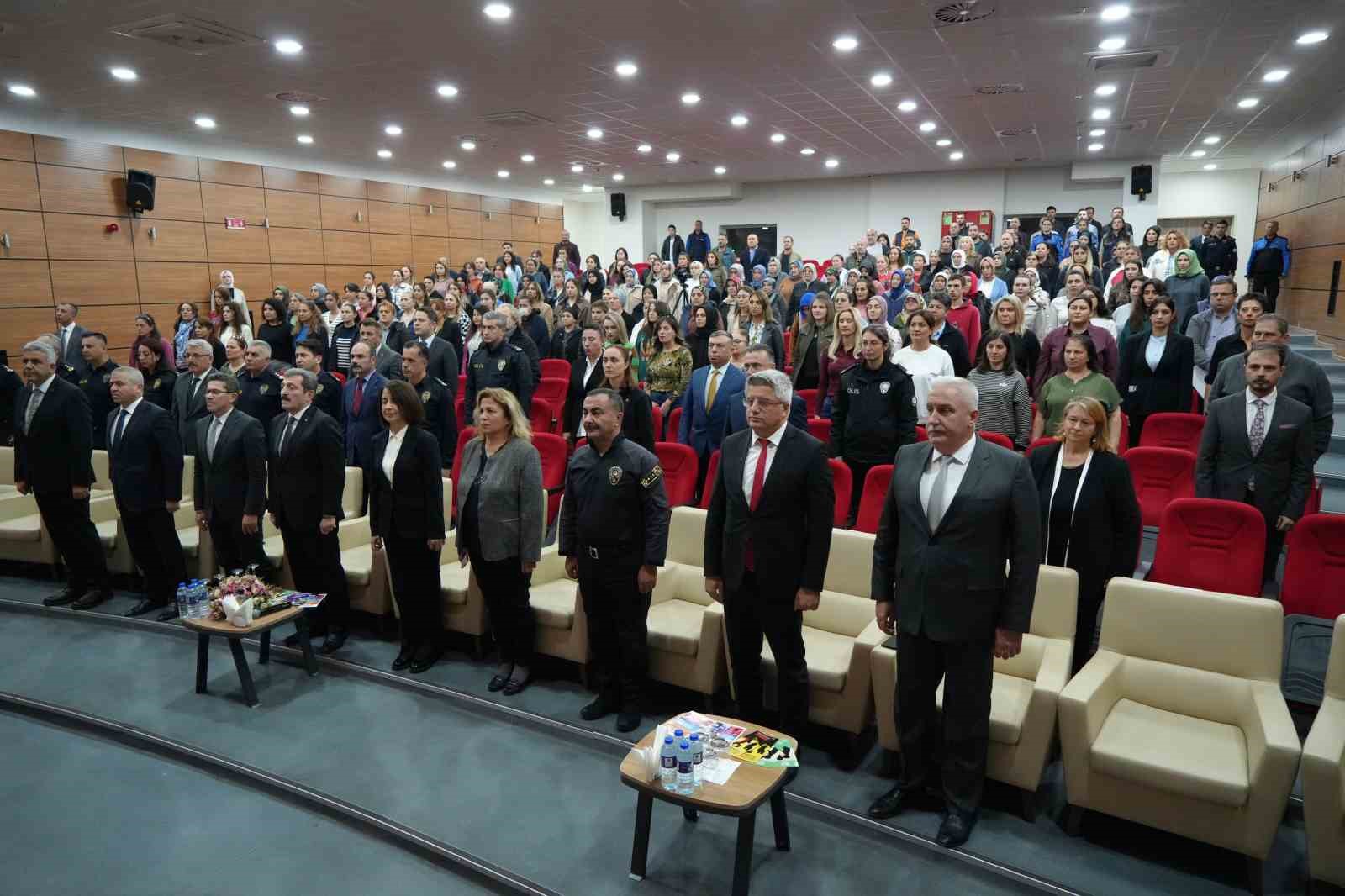 Aile içi ve kadına yönelik şiddetle ilgili sunum yapan Komiser Atakan Karataş, “Kadına kendisini değersiz hissettirmek de bir şiddet yöntemidir. Kadının özgürlüğünün kısıtlanması da bir şiddet yöntemidir. Şiddet ortamında büyüyen çocukların gelecekte nasıl bir psikoloji de olacağını tahmin edebiliyorsunuz. Komşunuz, iş arkadaşınız şiddete uğrayabilir ama bunun farkında olmayabilir. Çünkü bizde toplum baskısı var. İnsanlar şiddeti anlatmaya korkuyorlar. Devletimiz kadınlarımızı sonuna kadar arkasındadır. Kadın sığınma evlerimiz var. Maddi yardımlarımız var. Bizim açılan aile içi bürolarımız var. Oraya giderek bir ifade verdiğiniz takdirde bir risk formu çıkacak. Bir tedbir kararı uygulama gereği duyulursa uygulanacak. En çok kullandığımız tedbir kararı uzaklaştırma kararı ve konuttan uzaklaştırmadır. Bunlarla başlıyoruz. Daha sonra bu yetersiz kalırsa elektronik kelepçe tedbiri var. Bir mesafe belirliyoruz. Bu genelde 800 ile 1 kilometre civarı oluyor. Elektronik kelepçe konusunda da bir çözüm sağlayamazsak en son noktamız kimlik değişimidir. İlimizde bunun örnekleri de var. Kadın bambaşka bir hayata başlıyor. Geçmişle ilgili bağlantıları koparak hayata tutunmaya çalışıyor” açıklamasında bulundu.