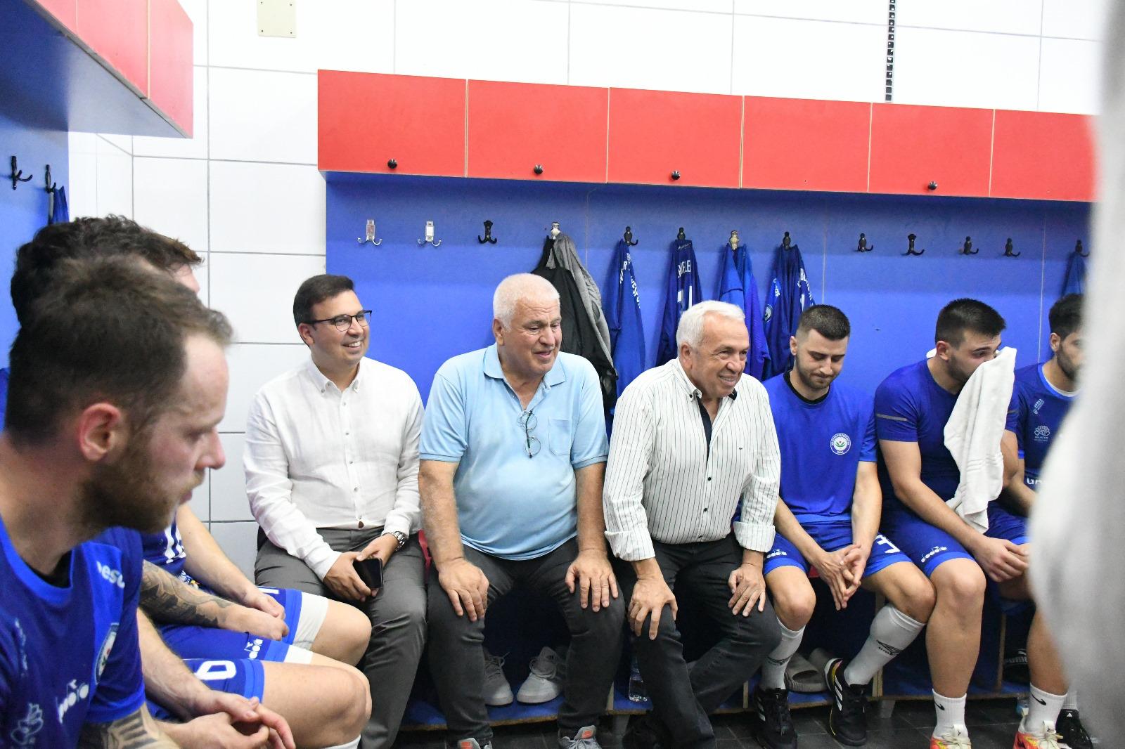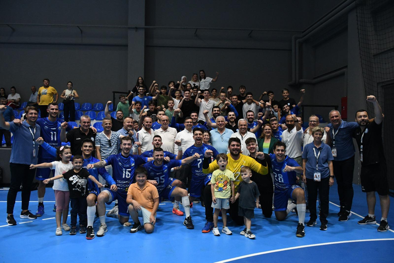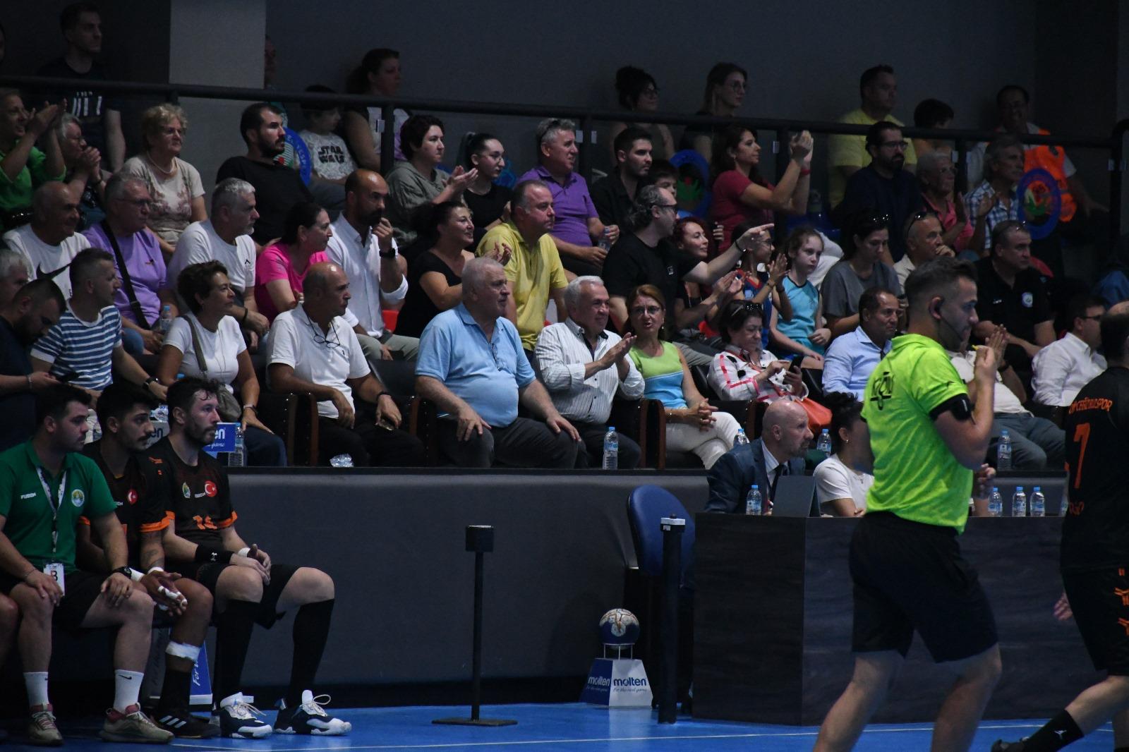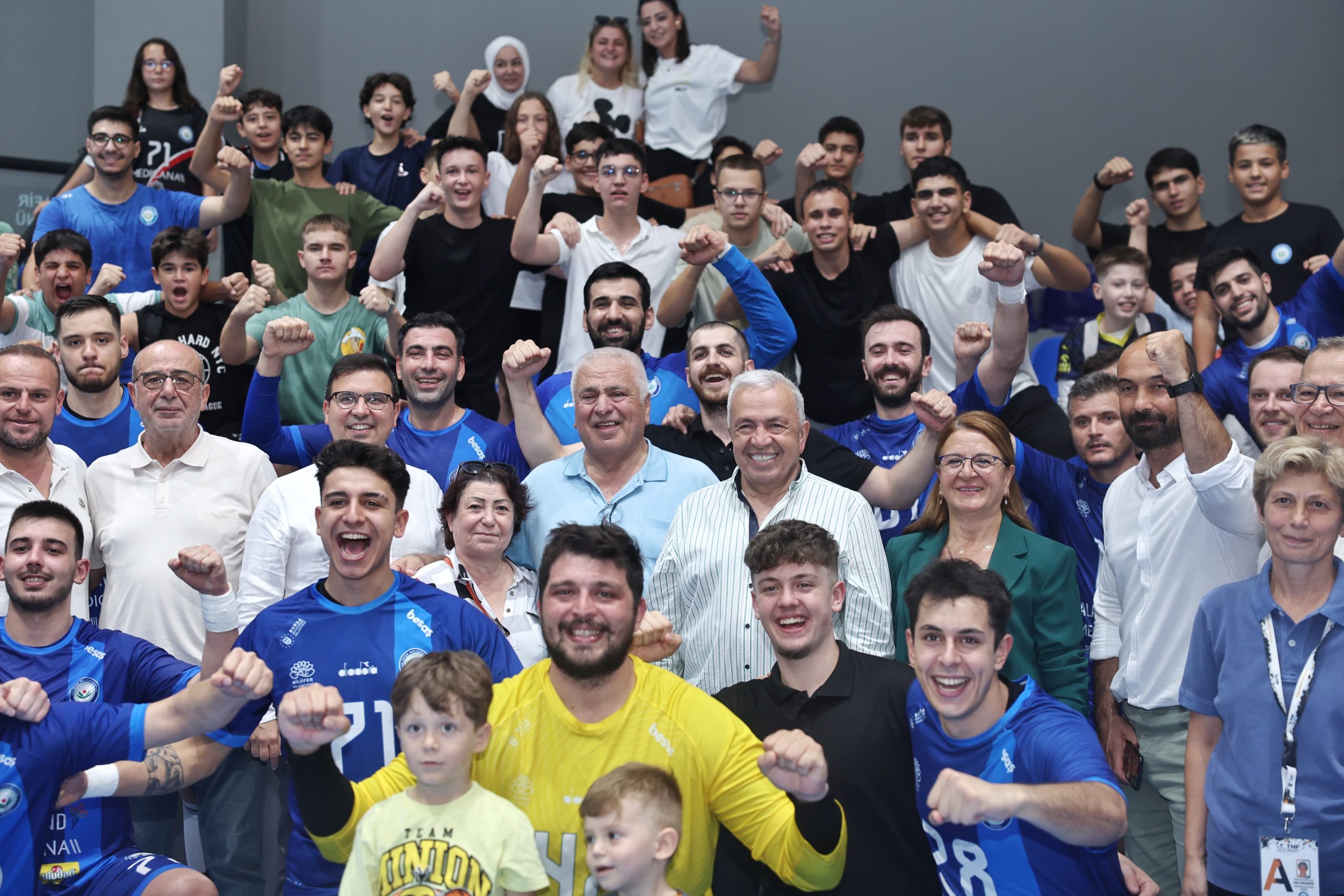 Maç sonunda hentbolcuları kutlayan Nilüfer Belediye Başkanı Şadi Özdemir, galibiyet sevincini takımla paylaştı.