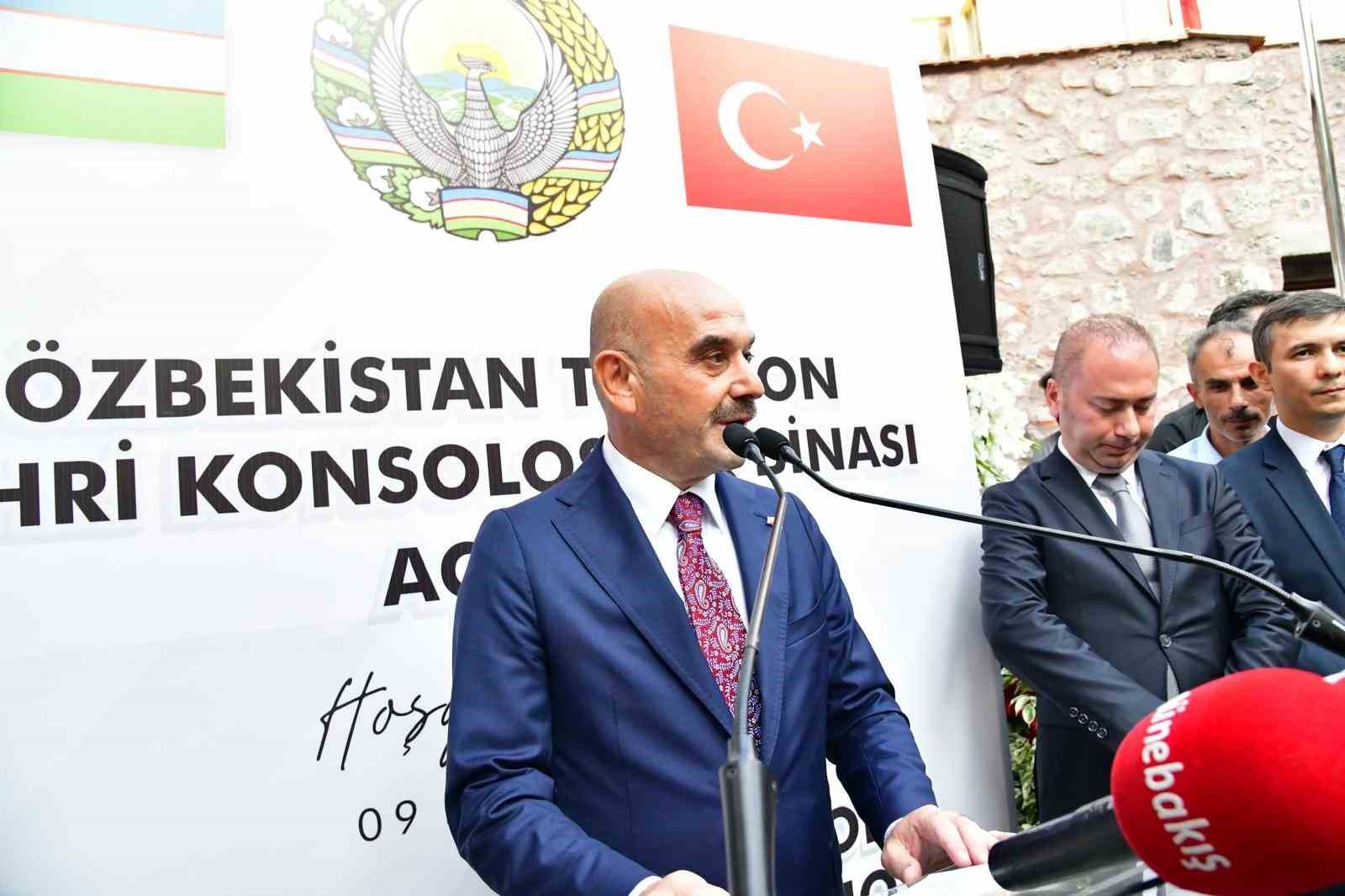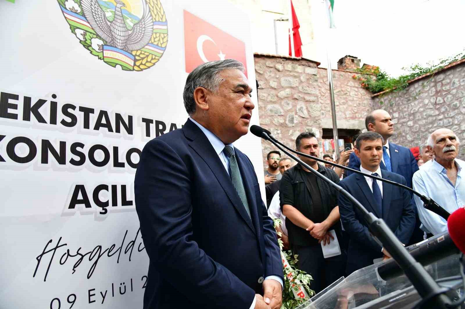 Özbekistan Cumhuriyeti Ankara Büyükelçisi Alişer Azamhocayev ise yaptığı konuşmada, “Özbekistan’ın 4 tane fahri konsoloslarının bulunduğunu kaydederek, “Bugün Trabzon’a açıyoruz. 1991 senesinde Türkiye, Özbekistan’ın bağımsızlığını ilk olarak tanıdı. Bunu hiçbir zaman unutmayacağız. Bu sene Özbekistan ile Türkiye diplomatik ilişkilerinin 32 senesi oldu. Çok boyutlu iş birlik üzerine çaba sarf ettik. Bu sene ticari hacmimizi 4 milyar dolara kadar çıkarmak niyetindeyiz. Ben Türkiye’ye geleli 6 yıl oldu. Yakında bizim Cumhurbaşkanımız Türkiye’ye teşrif bulundular. Bende Cumhurbaşkanımıza, ’Ben geleli 6 sene oldu. Torunlar var bensiz büyüyorlar’ dedim. Ben dönmek istiyorum desem, ’Bana 1. olarak ticari hacmi 5 milyar dolara çıkar sonra dönersin’ dediler. Sizden ricada bulunuyorum. 1 milyar dolar kalmış, bende torunlarımı göreyim. Sadık bey ile daha çok iş birliğini geliştireceğiz” diye konuştu.