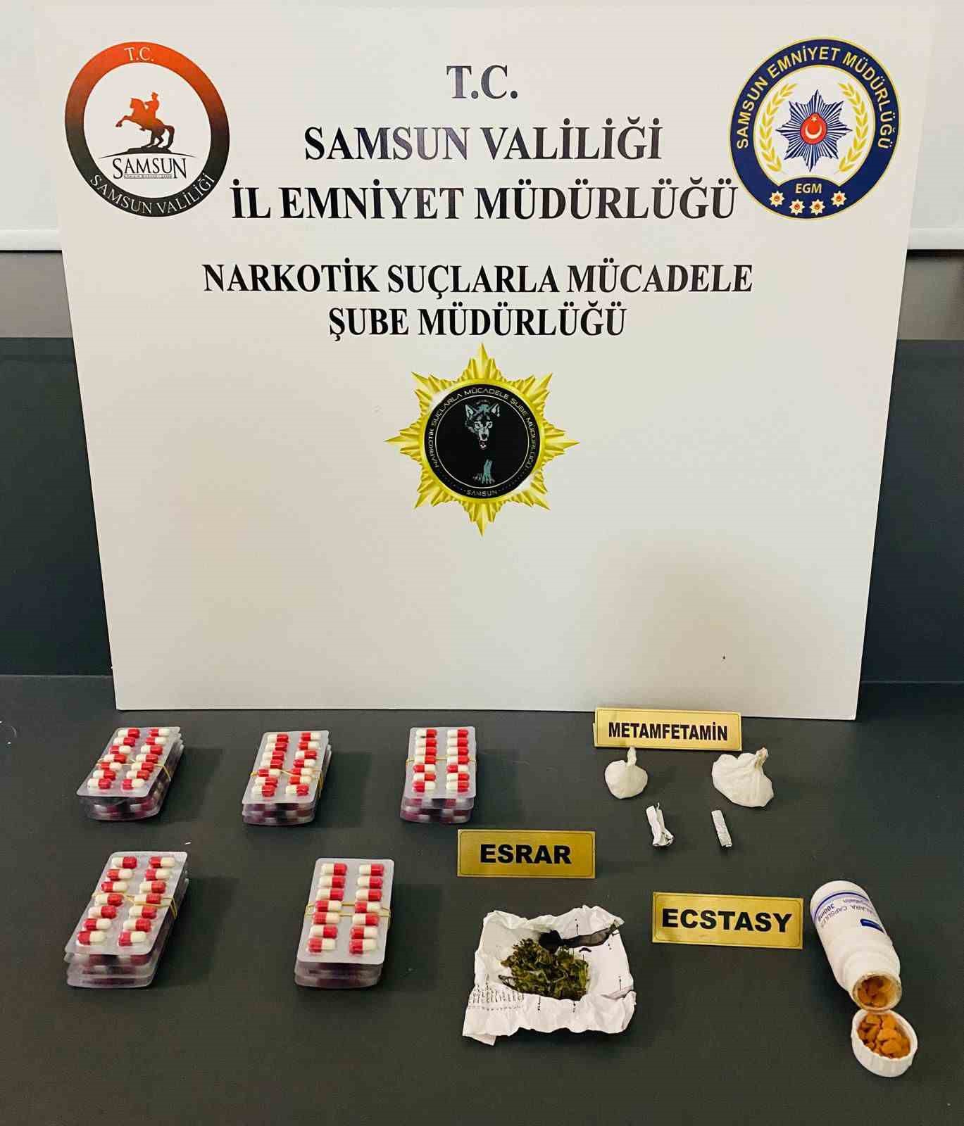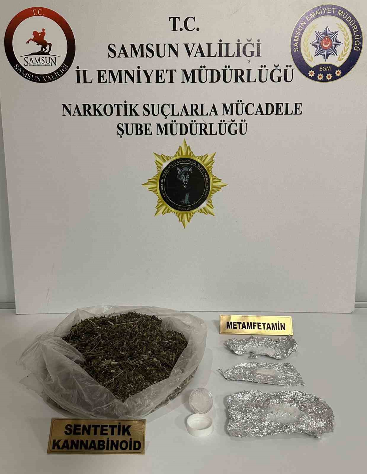 Edinilen bilgiye göre, Samsun Emniyet Müdürlüğü Narkotik Suçlarla Mücadele Şube Müdürlüğü ekipleri, İlkadım ilçesinde M.K. (24) ve F.O. (34) isimli şahısların bulunduğu ikamette yaptıkları aramada 210 gram sentetik kannabinoid, 11 gram metamfetamin ve 3 adet sentetik ecza ele geçirdi. 2 şahıs gözaltına alındı.