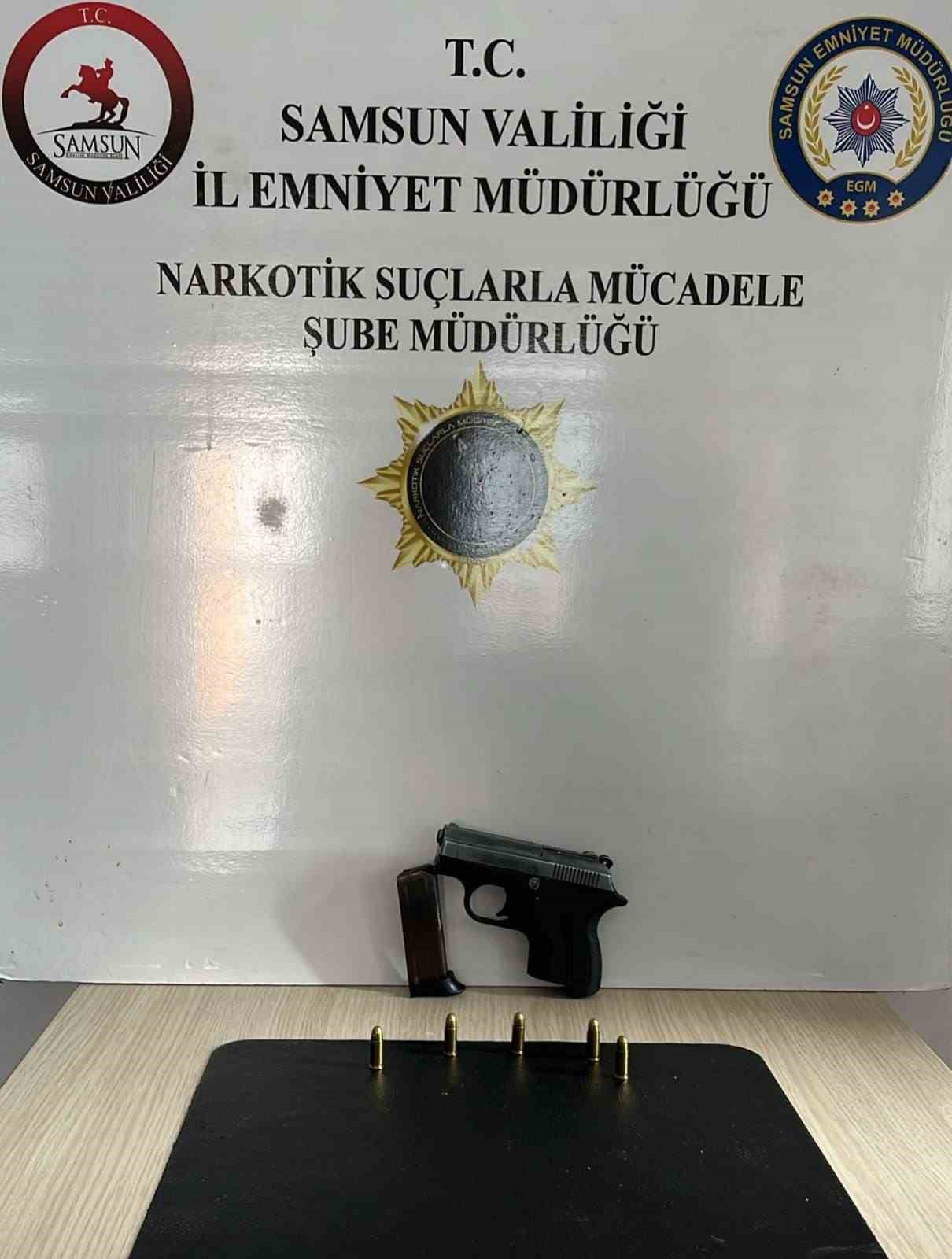 Edinilen bilgiye göre, Samsun Emniyet Müdürlüğü Narkotik Suçlarla Mücadele Şube Müdürlüğü ekipleri, İlkadım, Atakum ve Bafra ilçelerinde 3 şahsın üzerlerinde, işyerlerinde ve ikametlerinde arama yaptı. Yapılan aramalarda, 6027 adet sentetik ecza, 1 adet ruhsatsız tabanca, 5 adet tabanca fişeği ve uyuşturucu madde satışından elde edildiği değerlendirilen 44 bin 600 TL para ele geçirildi. Olayla ilgili 3 kişi gözaltına alındı.