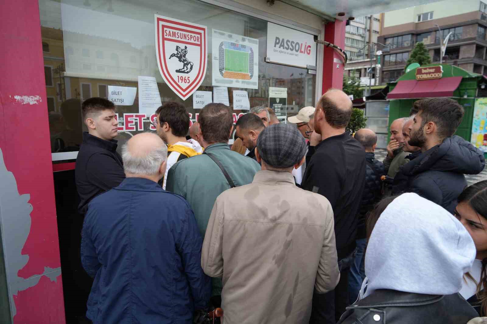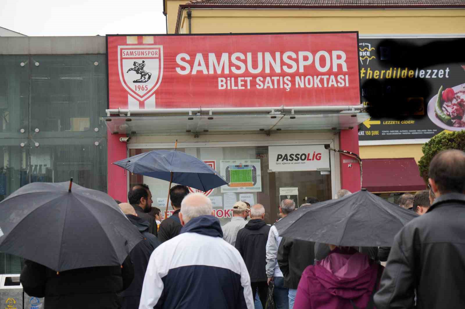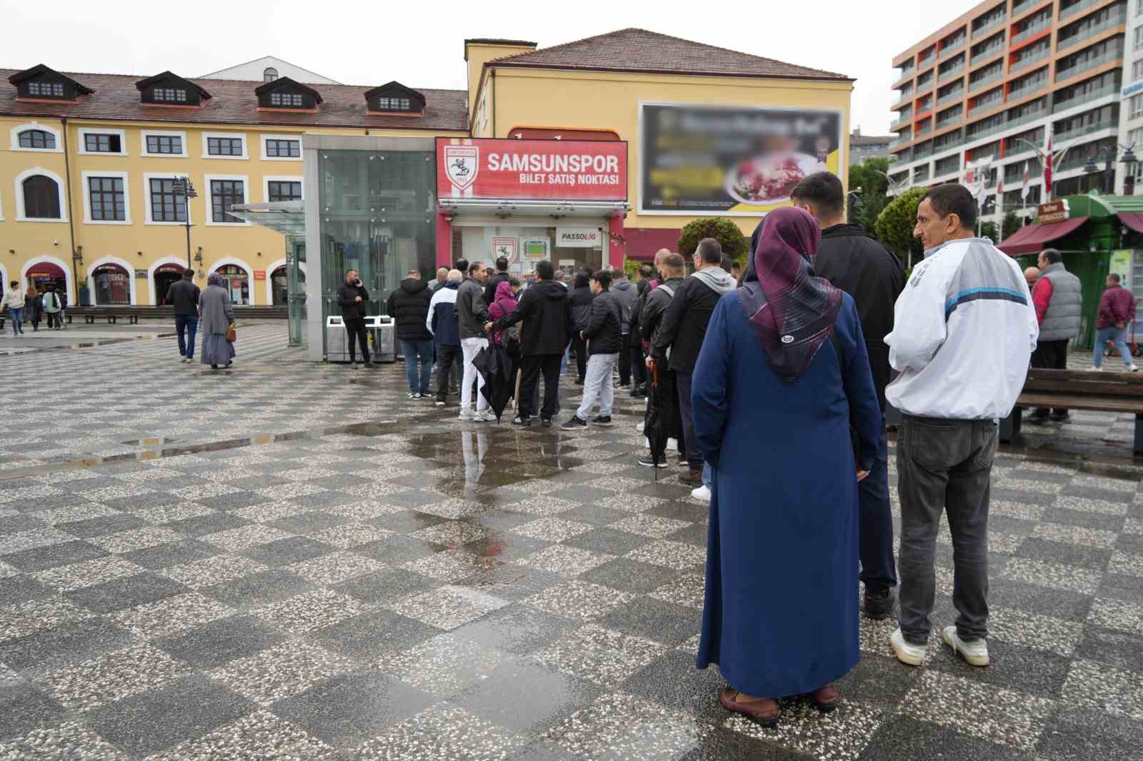 Süper Lig’de üst sıraları ilgilendiren Samsunspor-Fenerbahçe maçının biletlerine taraftarlar yoğun ilgi gösterdi. Samsunlu taraftarlar, gişeler açılmadan saatler öncesinde sıraya girerek, yağmur altında bilet almak için beklediler.