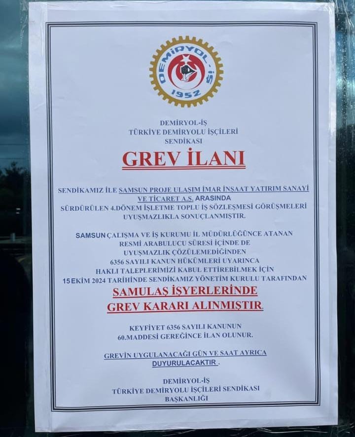 Samsun Büyükşehir Belediyesi SAMULAŞ ile Türkiye Demiryolu İşçileri Sendikası’nın (Demiryol-İş) sürdürdüğü toplu iş sözleşmesi görüşmelerinde bugüne kadar anlaşma sağlanamadı. Sendika, SAMULAŞ’ta grev kararı alındığını duyurdu. 6356 sayılı Kanun’un 60. maddesi gereğince grev ilan ettiklerini belirten Demiryol-İş Sendikası Sivas Şube Başkanı Feyzullah Duman, grev ilanını İŞKUR’a da ilettiklerini söyledi.