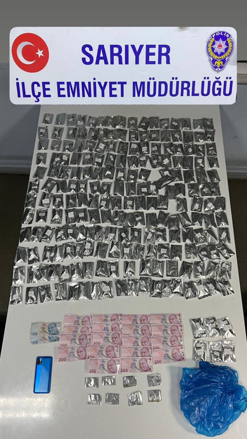 Sarıyer İlçe Emniyet Müdürlüğü ekipleri, uyuşturucu satıcılarına yönelik çalışma gerçekleştirdi. Yapılan çalışmalarda, 5 Ekim tarihinde Maslak Mahallesi Taş Yoncası Sokak üzerinde motosikletli bir şahıs şüphe üzerine durduruldu. 2 adet suç kaydı bulunan şüpheli A.B.’nin üstü ve motosikleti didik didik arandı. Yapılan aramalarda, 14 parça halinde satışa hazır olmak üzere toplam 36,88 gram marijuanna ve satıştan elde edilen 7 bin 550 lira ele geçirildi. Şüpheli yakalanarak gözaltına alınırken, emniyetteki işlemlerinin devam ettiği öğrenildi.