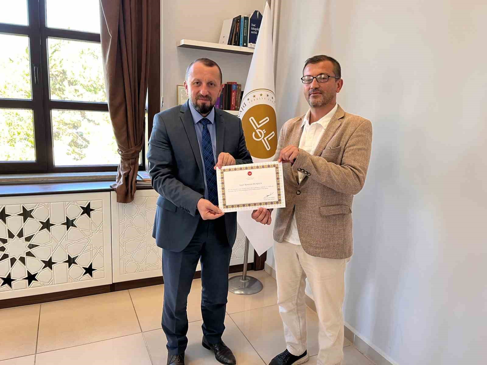 Kütahya’nın Simav ilçesinde 2024 yılında hatimle teravih namazı kıldıran personel ve hafız öğrencilere Diyanet İşleri Başkanı Ali Erbaş tarafından imzalanıp gönderilen teşekkür belgeleri teslim edildi.