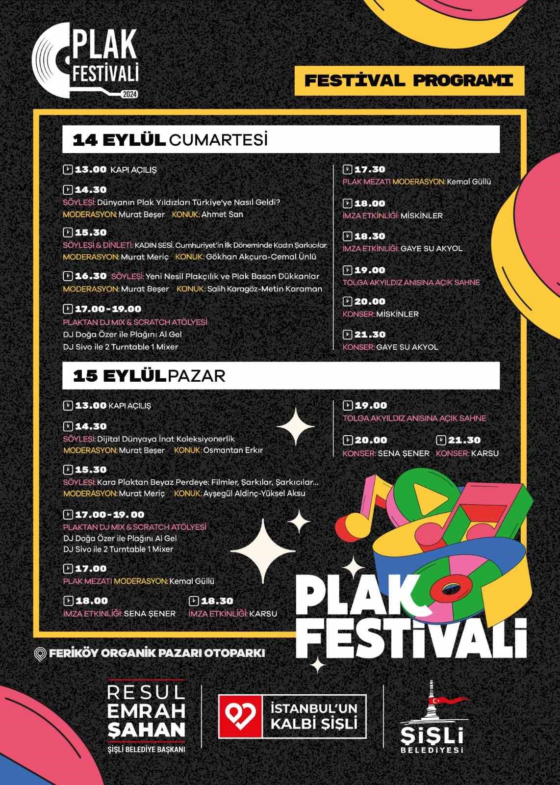 ŞİŞLİ BELEDİYESİ, MÜZİK DÜNYASININ ÖNEMLİ İSİMLERİNİ VE PLAK TUTKUNLARINI ‘ŞİŞLİ PLAK FESTİVALİ’ İLE 4’ÜNCÜ KEZ BULUŞTURUYOR. 14-15 EYLÜL TARİHLERİNDE, GERÇEKLEŞECEK FESTİVALDE SÖYLEŞİLER, MEZATLAR, İMZA GÜNLERİ GİBİ ETKİNLİKLERİN YANI SIRA KARSU, SENA ŞENER, GAYE SU AKYOL VE MİSKİNLER GİBİ ÜNLÜ SANATÇILARIN KONSERLERİ YER ALACAK.