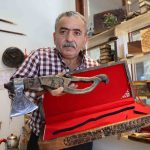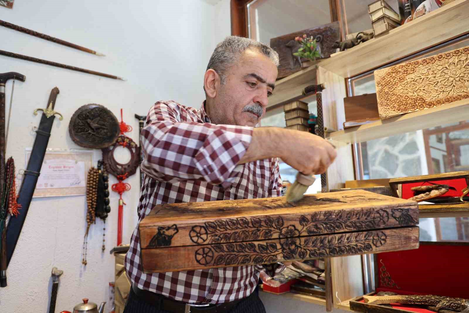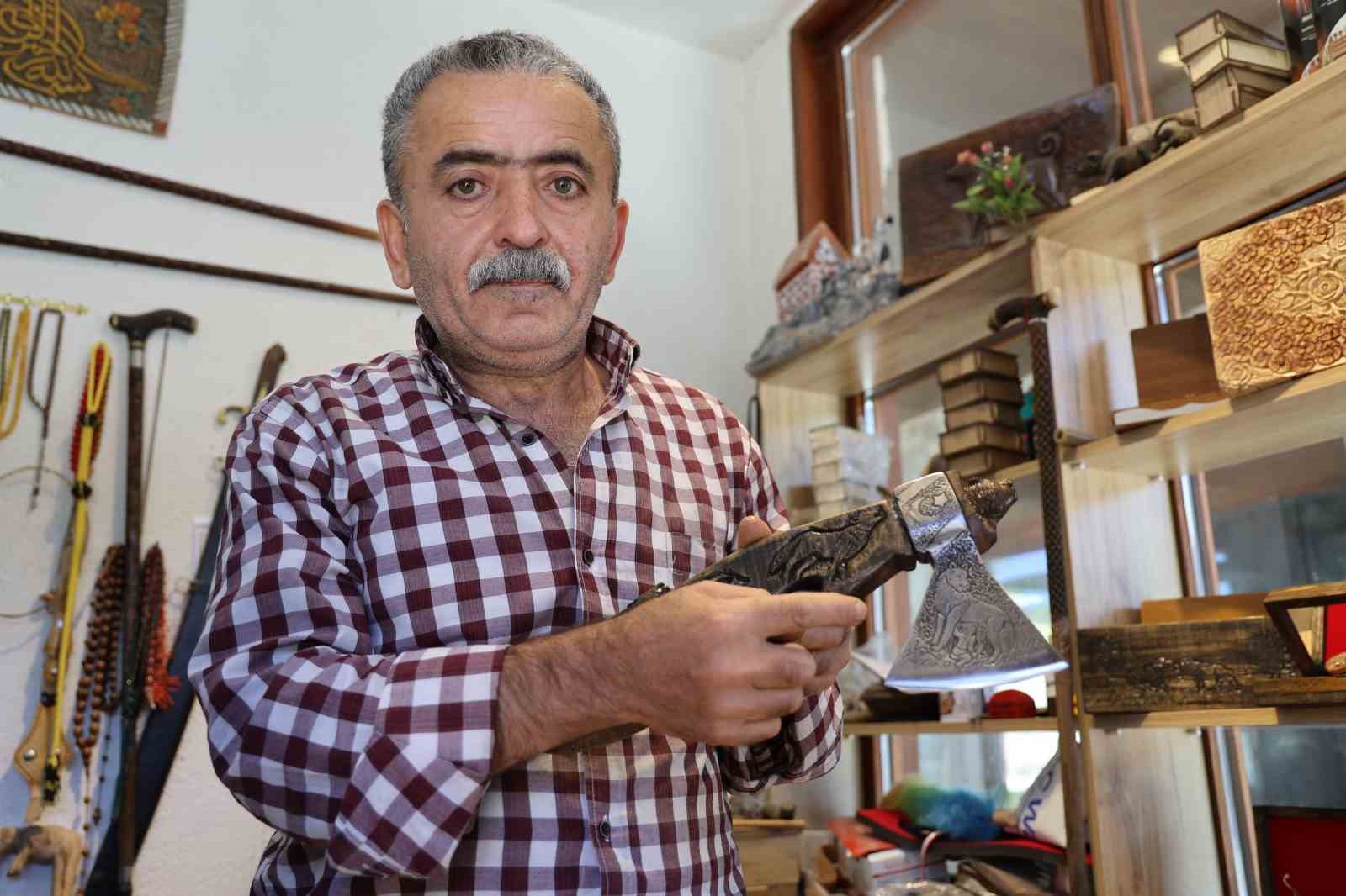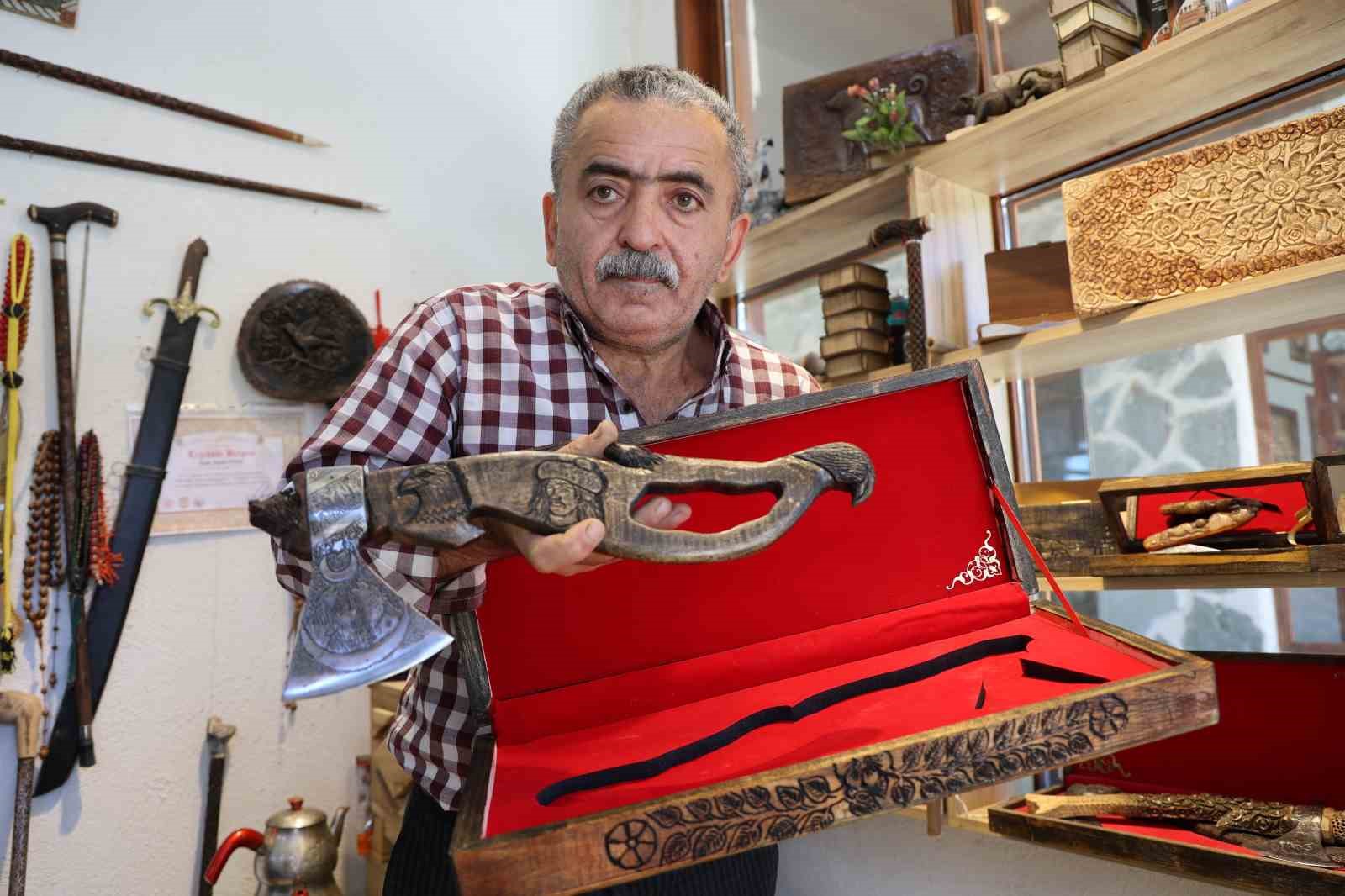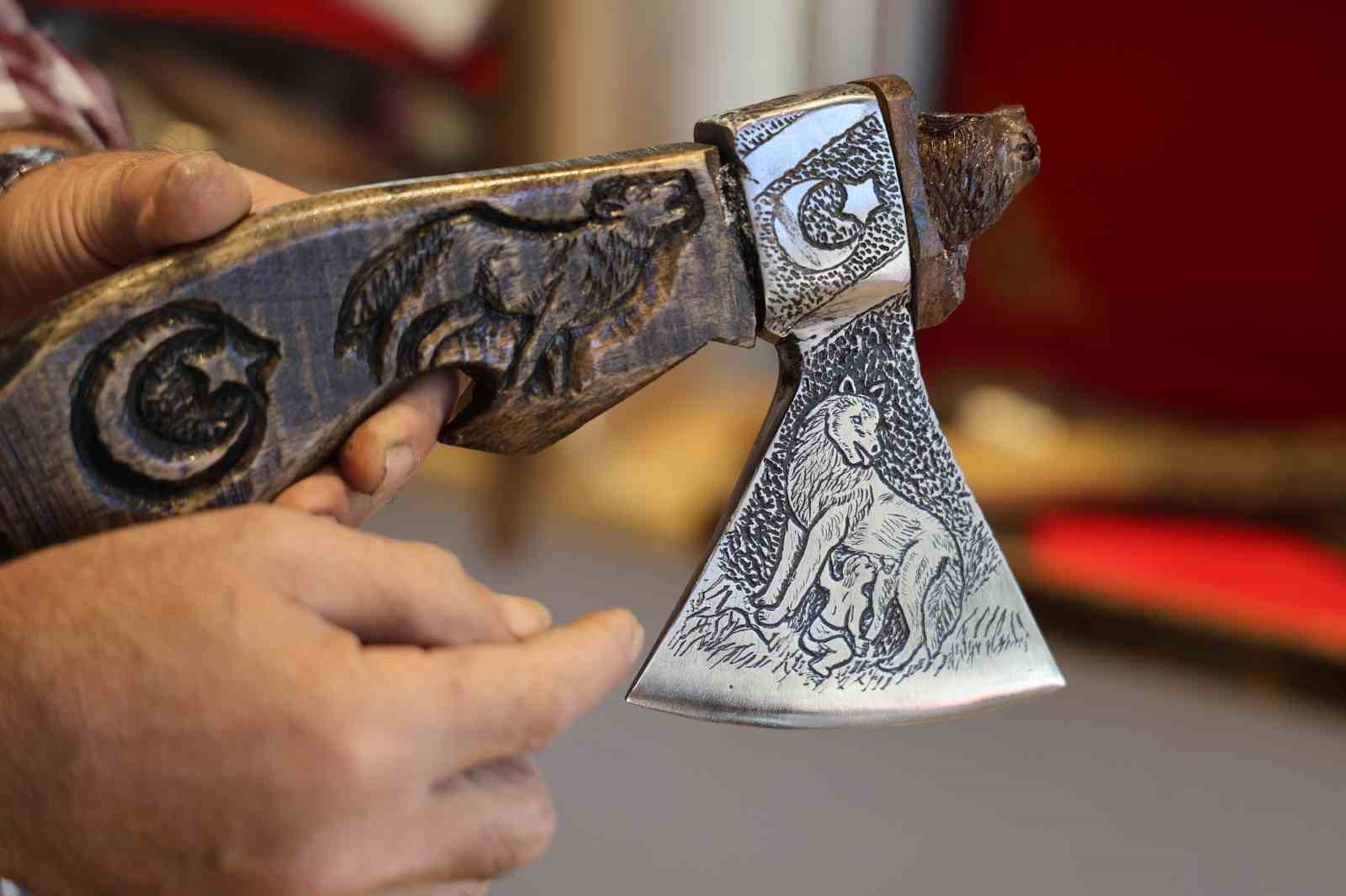 Ahşap üzerine Türk bayrağı, kurt ve Kürşat’ın portresini de işleyen Ünsal, “Türklerin şahlanışı, tekrardan dünyaya hâkim olmaları ile ilgili bir sipariş aldık. Kürşat’ın kurdu emmesi ve kurdun onu beslemesini çeliğe işledik. Dünyanın en sert çeliklerinden birisi olan tren makasından dövme çelik üzerine işledik, mahzenlerde çürüyen nacaklarımızı süsleyelim dedik ve o şekilde başladık yapmaya. Tek tek elde oyma işlemiyle yaptık. İlk olarak kazıdıktan sonra gerekli aletlerle işlemelerini yaptık. Sapını dişbudak ağacından yaptık, çok dayanıklı bir ağaçtır. Kendisi tren makasından yapılma dövme çeliktir. Bilemesine göre 8’lik demiri keser, bilemesine göre sakal tıraş eder. Üzerinde kurt işlemesi var, ay ve yıldız zaten bizim vazgeçilmezimiz. Diğer tarafında üç tane kurt yine ulur vaziyette. Tekrardan Kürşat’ın kartalı, kurdu, Kürşat’ın kendisi var. Şu anda günden güne artan bir talep var. Yurt dışına gönderiyoruz. Mısır, Irak Amerika, Fransa, Almanya’ya gönderdiğimiz ürünlerimiz oldu. Genelde iş adamlarına gönderiyoruz, Başbakanlara gönderdiğimiz ürünlerimiz oldu” dedi.
