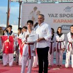 Programda konuşan Sultangazi Belediye Başkanı Abdurrahman Dursun, “Sultangazi’de 5 yaşında çocuklarımıza kaşif çocuk projemizle eğitim vermeye başlıyoruz. 8 yaşına geldiklerinde bırakmıyoruz ve çocuklarımızı onları bilim merkezimize alıyoruz. Bu esnada okulda başlamış oluyor. Okullarıyla senkronize şekilde eğitimlerine devam ettiriyoruz. Sonrasında liseye geçiş sınavına hazırlanan öğrencilerimize ve üniversiteye hazırlanan öğrencilerimize eğitim vermeye SEDA (Sultangazi Eğitime Destek Akademisi)’yle devam ediyoruz. 3 bin 600 öğrencimize çok özel bir dershanecilik eğitimi veriyoruz, esasında sizler içerisinde çocuklarını özel dershaneye gönderen vardır. Biz 3 bin 600 öğrencimize çok özel bir eğitimi ücretsiz olarak veriyoruz. Esasında bu aile bütçesine çok büyük bir katkı. Bu sene 24 öğretmenimizi daha kadromuza kattık ve artık Sultangazimizde bir büyük okulda bulunan öğretmen kadar Sultangazi Belediyesi’nde çalışan öğretmenler var. Tam 90 öğretmenimizle çocuklarımıza eğitim vermeye devam ediyoruz. Temmuz ayı itibari ile başladığımız spor aktivitelerimizde 17 branşla tam 6 bin çocuğumuza eğitim verdik. Bugün kapanış programındayız ancak Sultangazi’de spor devamlıdır ve spor hiçbir zaman bitmez. Buradaki gençlerimiz sadece Yaz Spor Okullarında değil devam eden spor okullarında da eğitimlerine devam edeceklerdir. Ancak bugün 6 bin öğrencimiz için bir kapanış programı yapıyoruz. Pazartesi itibarıyla yeni sezon için kayıtlarımızı da almaya başlayacağız. Sultangazi bu başarılarıyla hem ulusal medyada ve ulusal federasyonlarda görev almaya hak kazandı. Güreş takımımız Süper Lig’de yarışan bir takım oldu. Kasım ayında Türkiye’de spor federasyonların seçimleri başlayacak biz ulusal bazda faaliyet gösteren Dünya Şampiyonalarında organizasyonlar yapan federasyonların seçimlerine katılacağız. Çok güçlü programlarda ve çok güçlü işlerde sizlerle beraber olacağız” şeklinde konuştu.