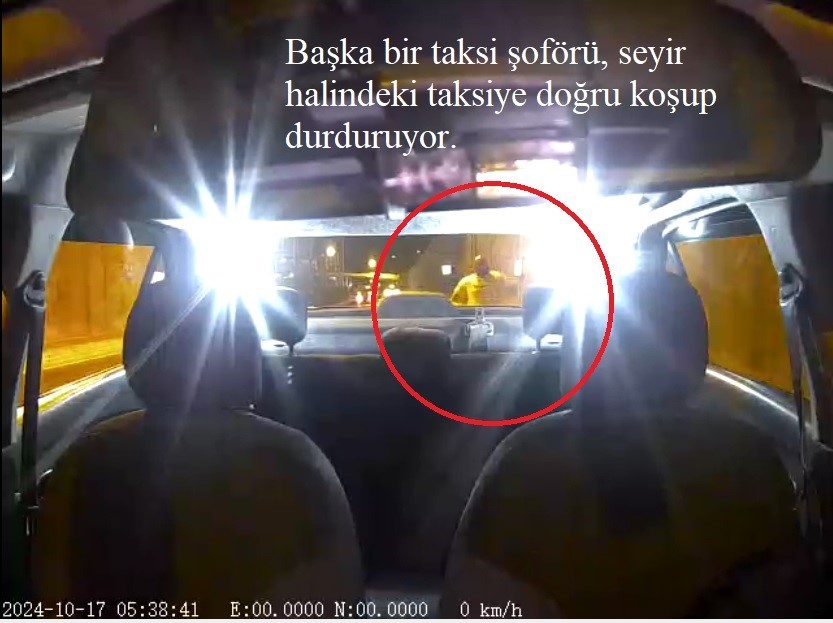 Bu sırada, aracın içinde şoför olmadığını gören vatandaşlar neye uğradığını şaşırdı. Ters yöne giren ve kendi kendine giden taksiyi gören bir taksi şoförü, aracın peşinden koştu, frenine basarak durdurdu. Tüm bu yaşananlar ise saniye saniye taksinin araç içi kameralarına yansıdı. İzmir emniyeti, şimdi her yerde taksiyi kaçıran şahsı arıyor.