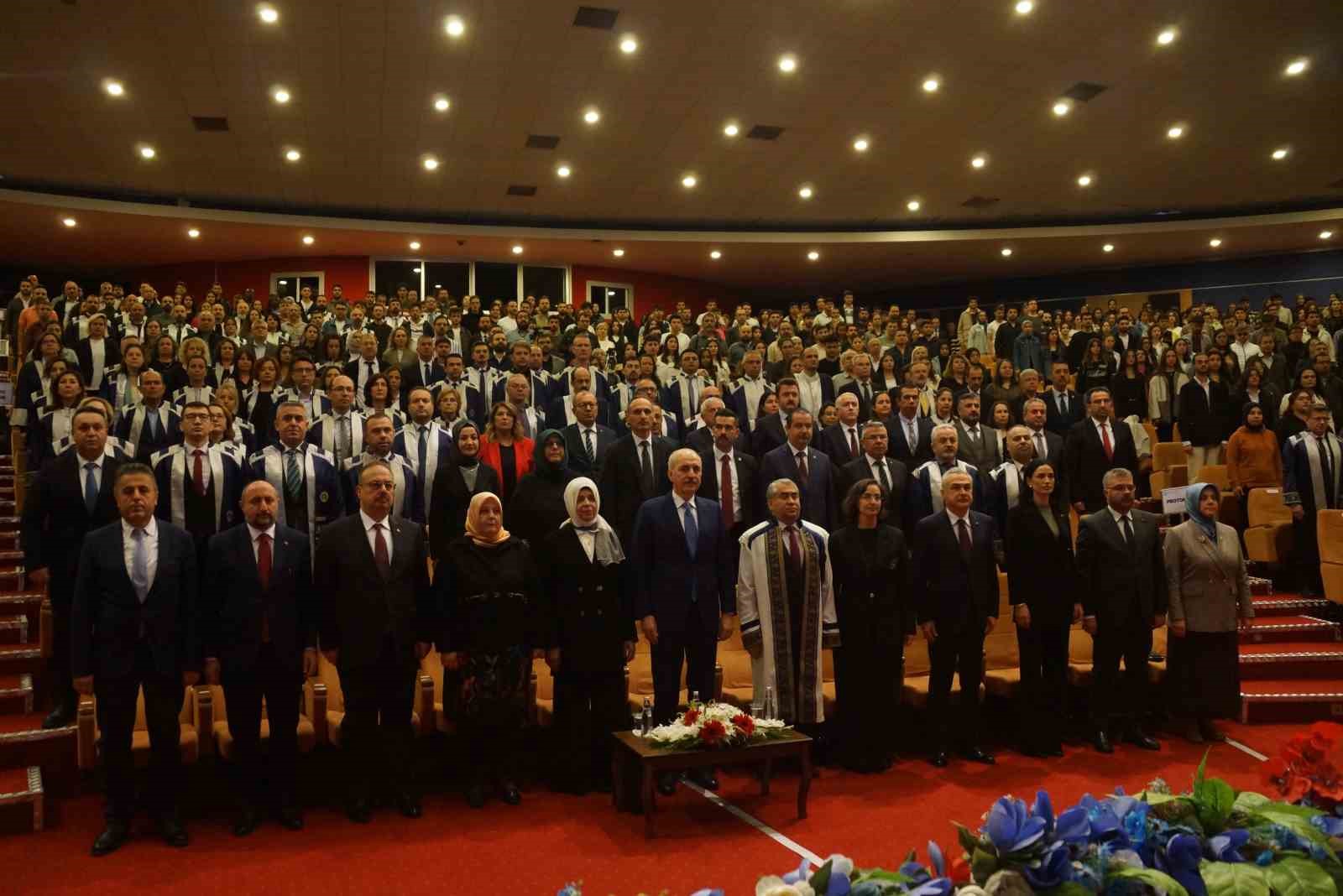 Yeni akademik yılın hayırlı olması temennisinde bulunarak konuşmasına başlayan Kurtulmuş, “Türkiye Cumhuriyeti Devleti’nin dünyadaki en güçlü ülkelerden birisi olması için elimizdeki bütün imkanlarla mücadele etmek hepimizin vazifesidir. Hangi yerde olursak olalım, hangi görevi yapıyor olursak olalım, ister öğretim üyesi, ister siyasetçi, ister öğrenci, ister iş insanı, ister çiftçi, ister sanatçı ne olursak olalım her birimiz yaptığımız işi en iyi şekilde yapacağız. Türkiye’yi özellikle Türkiye Yüzyılı olmasını arzu ettiğimiz Cumhuriyetimizin ikinci asrında daha da yukarıya çıkaracağız. İlimde, sanatta, kültürde her alanda üretimde, teknolojide şimdi olduğumuz yerden çok daha ileriye getireceğiz. Güçlü ve büyük Türkiye hedefinde merkez üslerimizden birisi olan bir üniversite anlayışı içerisinde yaklaşarak her birinize gerek öğretim üyesi gerek yönetici gerek öğrenci olan insanlarımıza kardeşlerimize gerçekten üstün başarılar diliyorum” ifadelerine yer verdi.