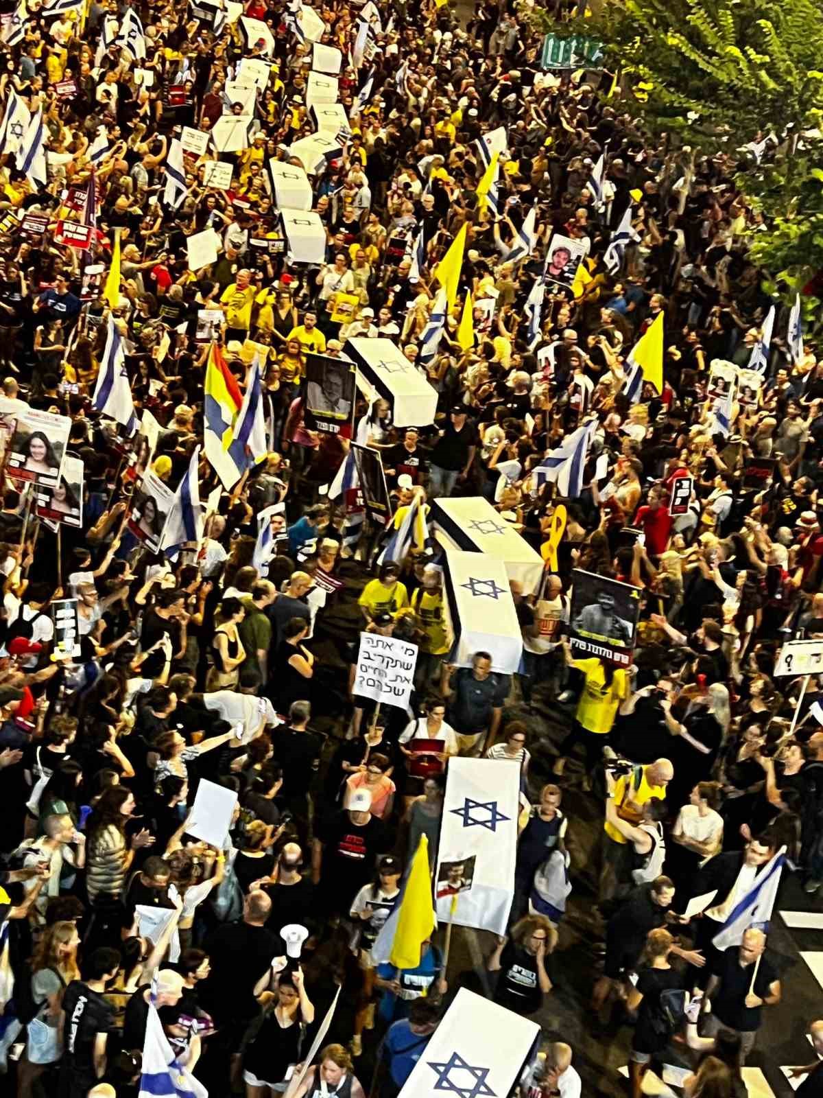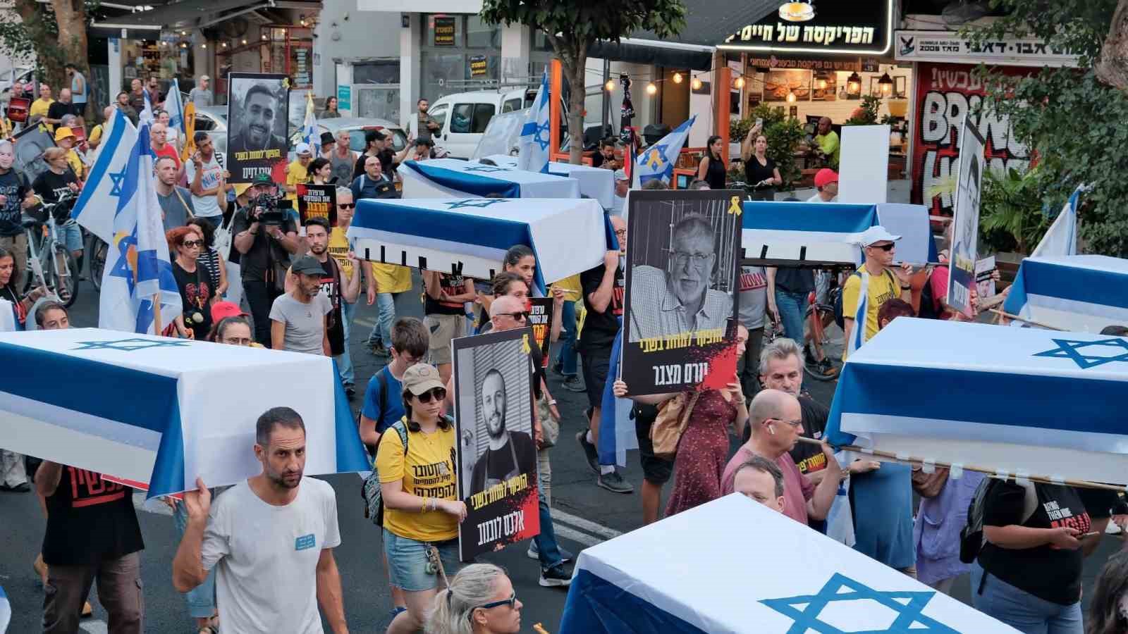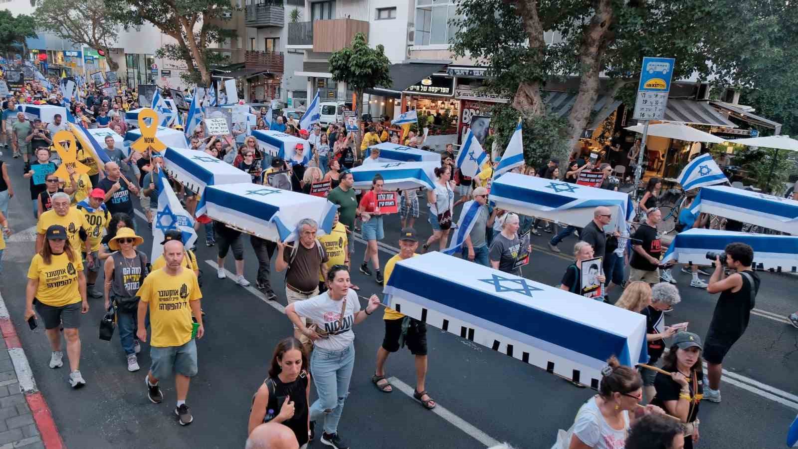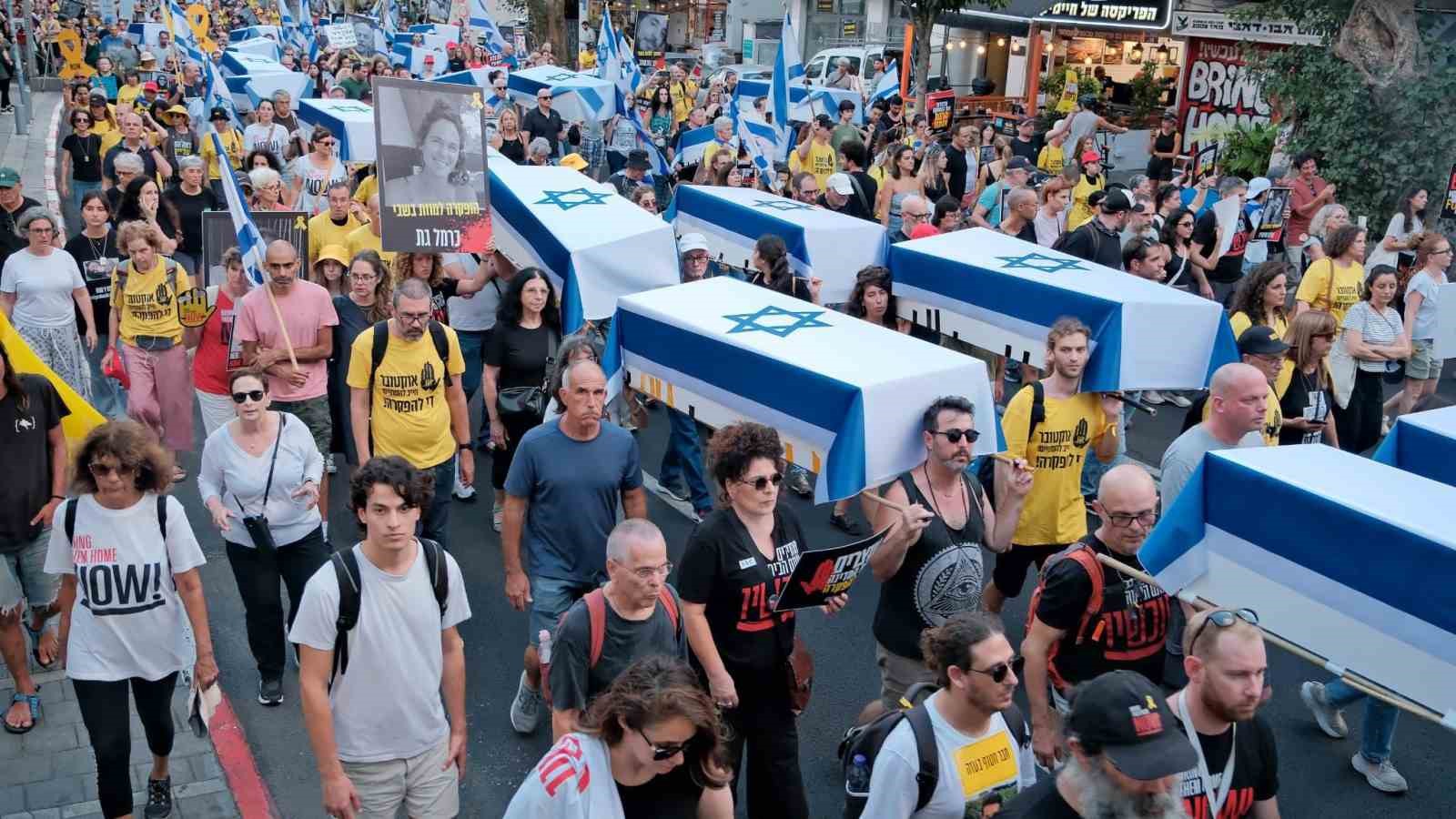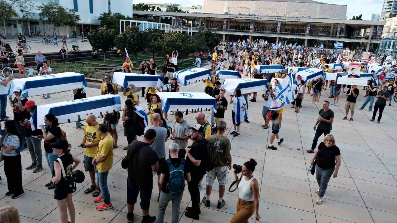 İsrail ve Hamas arasında esirlerin takası da dahil Gazze Şeridi’nde ateşkese ilişkin anlaşmaya yönelik diplomatik çabalar devam ederken, İsrail’in başkenti Tel Aviv’de Hamas ile ateşkes anlaşması yapılması için 5 gündür hükümet karşıtı protestolar sürüyor. Protesto, esirlerin yakınlarının da katılımıyla Habima Meydanı’ndan Gazze Şeridi’nde esir tutulurken hayatını kaybeden 27 esiri temsil eden tabutlarla düzenlenen sembolik bir cenaze töreni ile başladı.