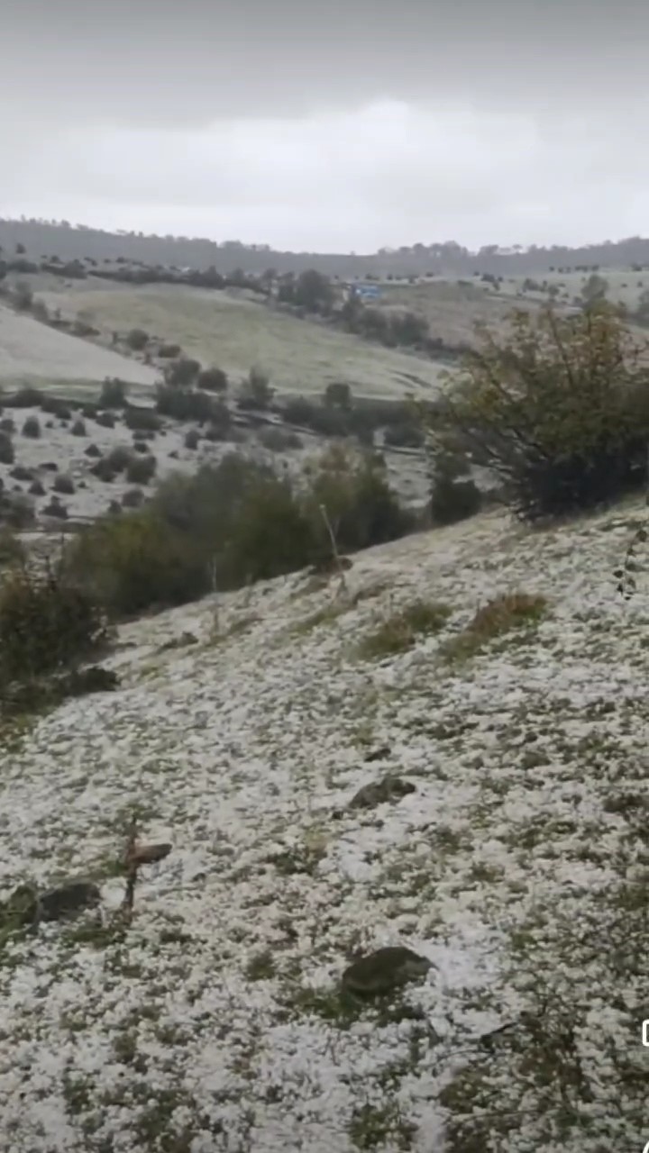 Tokat’taki Kızkayası Yaylası’nda aniden başlayan dolu yağışı çevreyi beyaza bürürken, hayvanlarını otlatan çoban zor anlar yaşadı.
