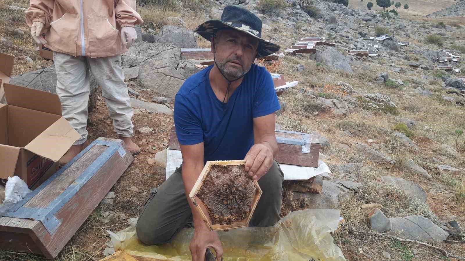 Konya’nın Bozkır ilçesinde Toros Dağlarının zirvelerindeki arılıklarda bulunan kovanlara ayı dadanınca ballar erken hasat edildi.