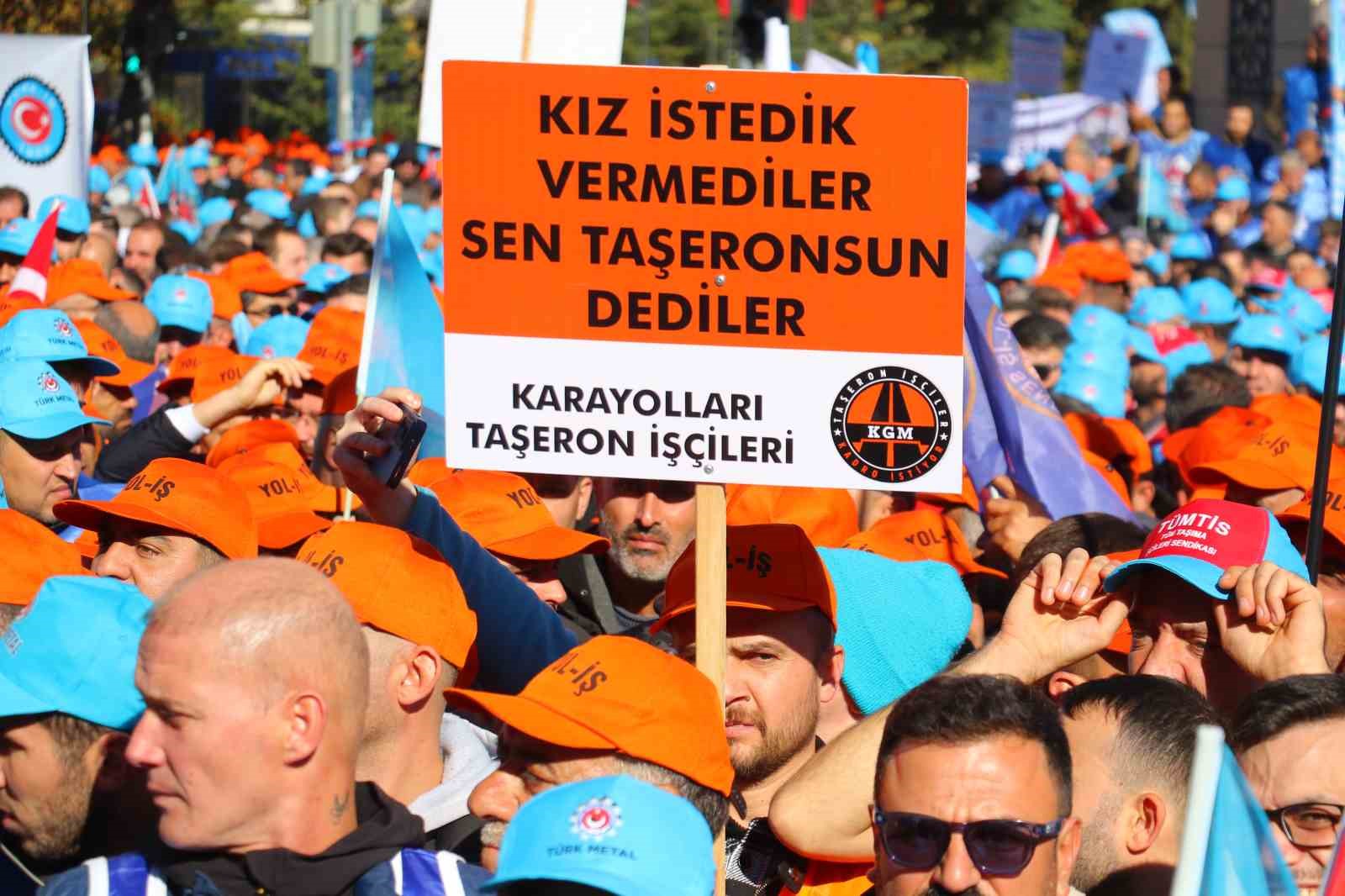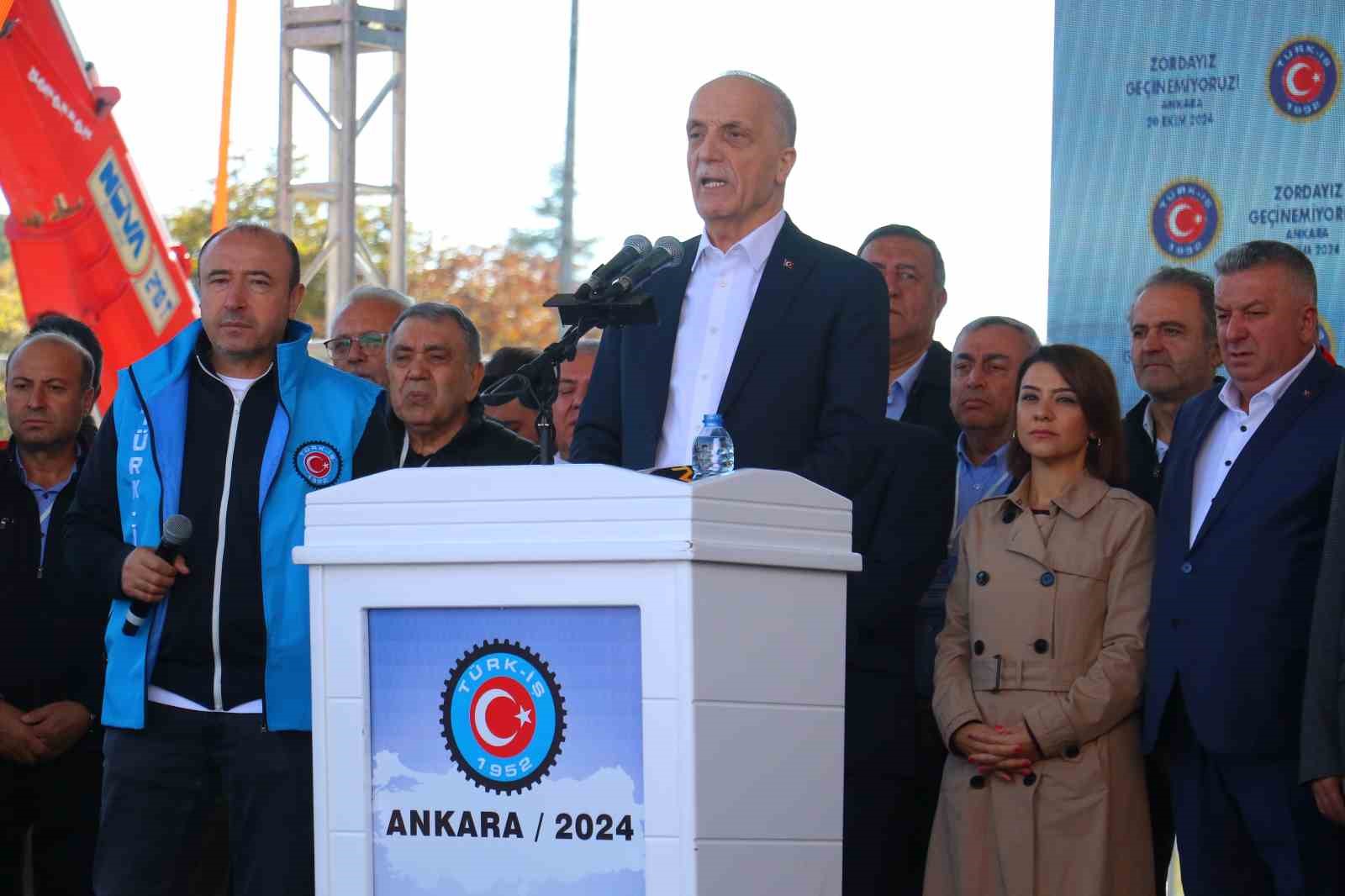 Türk-İş tarafından düzenlenen ’Zordayız, geçinemiyoruz’ mitingi Ankara’da yapıldı. Türkiye’nin çeşitli illerinden Ankara’ya gelerek mitinge katılan yaklaşık 150 bin işçi, Anadolu Meydanı’nda açtıkları pankartlar ile seslerini duyurmaya çalıştı. Mitingde konuşan Türk-İş Genel Başkanı Ergün Atalay, işçilerin emekli edilmesi halinde sağlık, enerji ve savunma sanayii gibi alanlarda üretim yapılamayacağını söyledi.