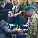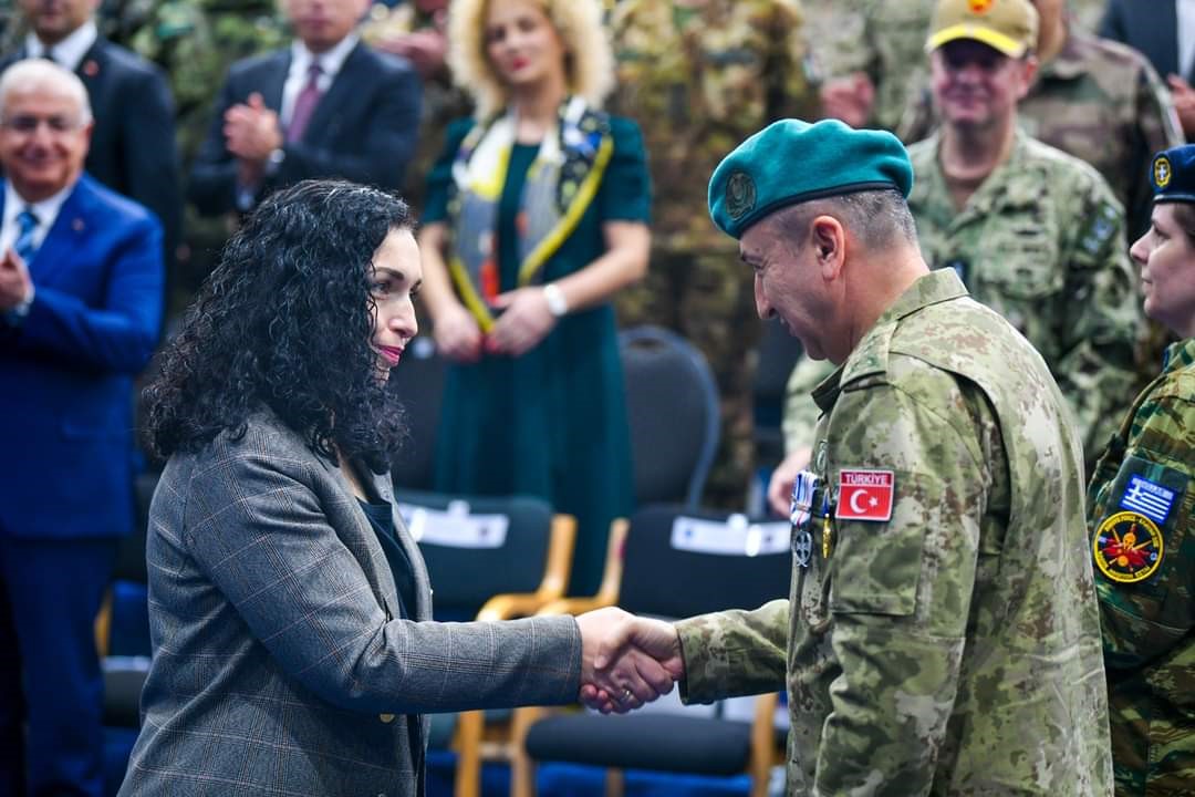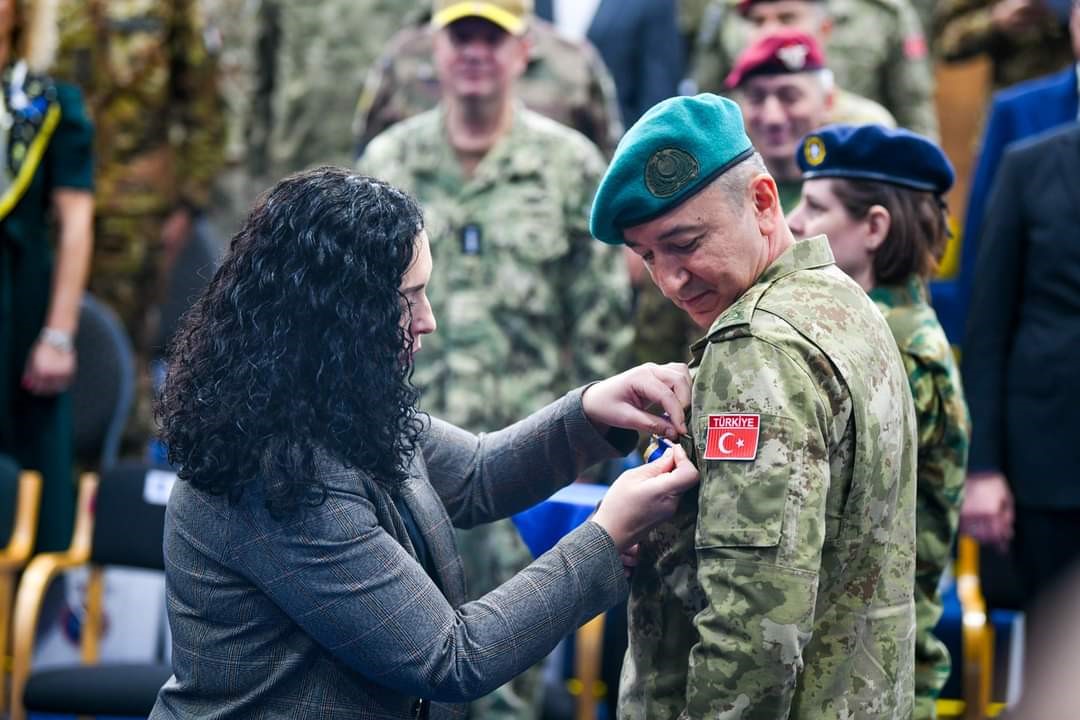 Törenin ardından Kosova Cumhurbaşkanı Vjosa Osmani, Kosova’da bir yıllık görev süresi tamamlanan Tümgeneral Özkan Ulutaş’a madalya takttı.