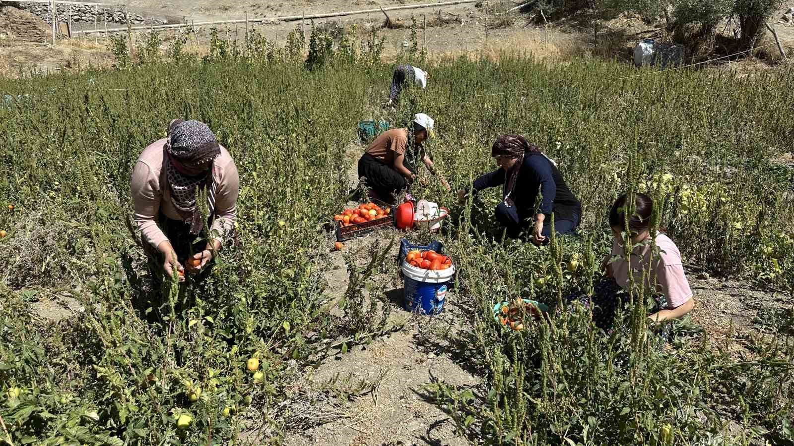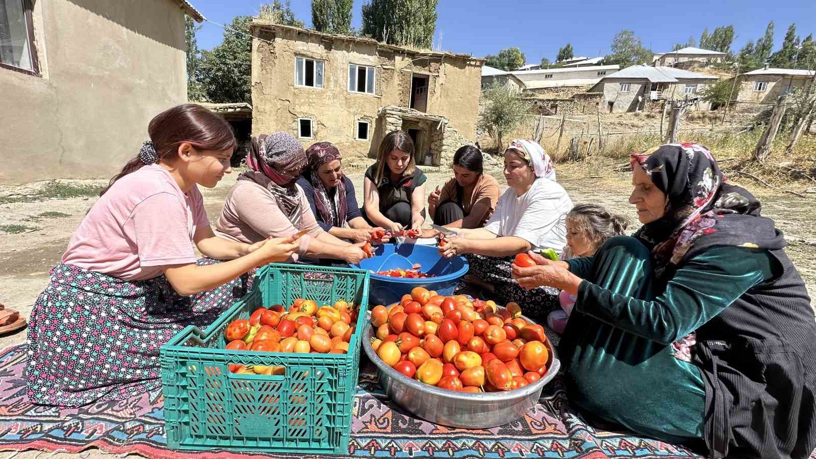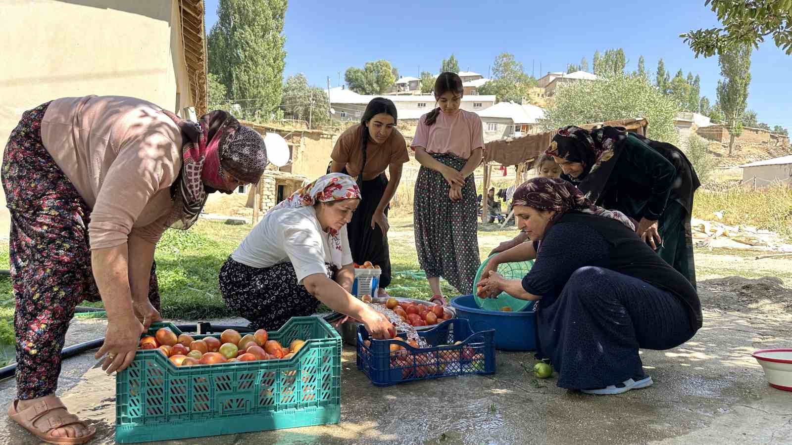 Yüksekova’ya 30 kilometre uzaklıkta bulunan Dilektaş köyün Çalımlı mezrasında çiftçi kadınlar kışlık ürünler için kolları sıvadı. Büyük emekler vererek kendi ihtiyaçlarını kendileri yaptıklarını belirten çiftçi kadınlar, eski yöntemler kullanılarak kışa hazırlanıyor. İlkbaharda kadınlar tarafından ekimi gerçekleştirilen ürünlerin hasadı sonbaharın yaklaşmasıyla yapıldı. Toplanan domatesler yıkandı ardından eski yöntemle dışarıya kurulan kazanlarda kaynatıldı. Kaynatılan domatesler kavanozlara konularak kışa hazırlık yapıldı.